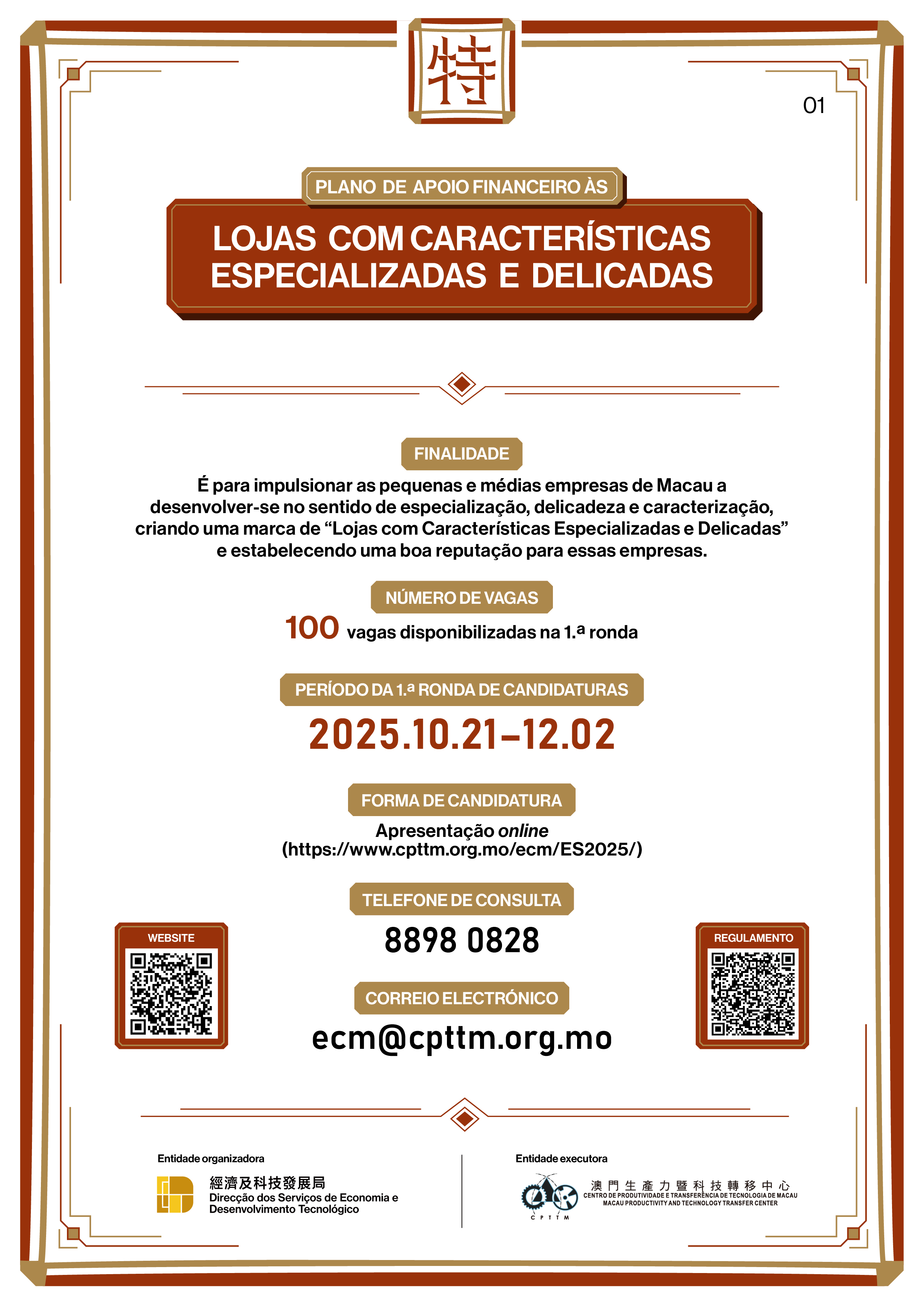 A chefe da Divisão de Apoio às Actividades Industriais e Comerciais da DSEDT, Chan Chi Ieng, referiu que o CPTTM actua como entidade executora do “Plano de Apoio Financeiro às Lojas com Características Especializadas e Delicadas”. A primeira ronda proporciona 100 vagas, cujo período de inscrição é de 21 de Outubro a 2 de Dezembro de 2025. Os interessados que pretendem inscrever devem possuir a qualificação de “Loja Certificada”, e apresentar plano de negócio e projecto de exploração elaborados por si próprio.