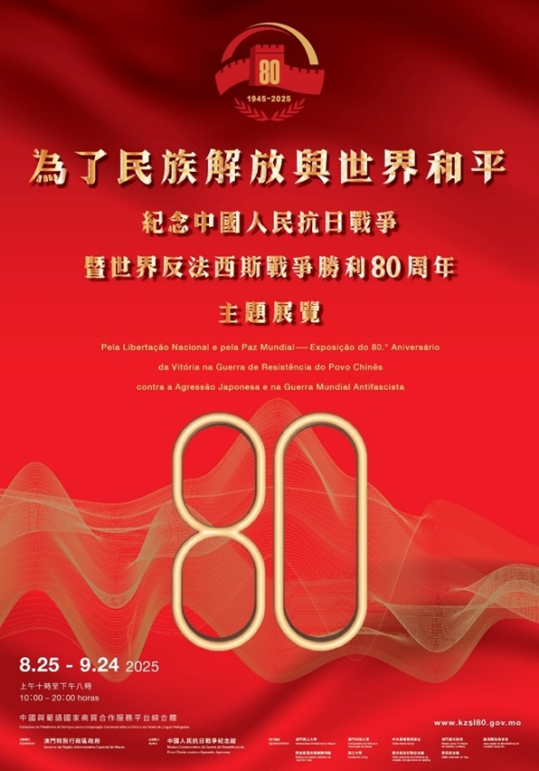 • “Pela Libertação Nacional e pela Paz Mundial—Exposição do 80.º Aniversário da Vitória na Guerra de Resistência do Povo Chinês contra a Agressão Japonesa e na Guerra Mundial Antifascista” está patente ao público até ao dia 24 de Setembro, diariamente, das 10h00 às 20h00, com entrada gratuita
