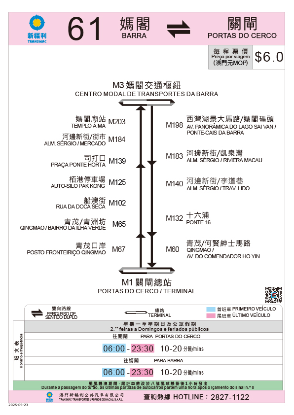 Adicionalmente, com a conclusão sucessiva das obras de Estação Elevatória de Águas Pluviais e Drenagem no Porto Interior e de optimização do respectivo local de paragem de autocarros, a partir de 23 de Setembro, a carreira n.º 6B retomará a paragem “RIVIERA MACAU/TERMINAL” como seu terminal de partida, e passará a fazer escala na paragem adicional “AV. PANORÂMICA DO LAGO SAI VAN/CENTRO MODAL DE TRANSPORTES DA BARRA”, cancelando simultaneamente a paragem na “ALM. SÉRGIO/RIVIERA MACAU”. Para coordenar com a conclusão das obras da zona de lazer à beira da Rua do Comandante João Belo, a carreira n.º H2 retomará, no mesmo dia, a fazer escala na paragem de desvio “RUA DE FAI CHI KEI/EDF. LOK YEUNG FA YUEN” próxima da nova estação de elevatória (em direcção à Rua Norte do Patane, a cerca de 60 metros da paragem inicial). Para ampliar ainda mais a cobertura de serviços, a carreira n.º 61 passará a fazer escala nas paragens “QINGMAO/BAIRRO DA ILHA VERDE”, “RUA DA DOCA SECA”, “PRAÇA DE PONTE E HORTA”, “ALM. SÉRGIO/MERCADO” e “ALM. SÉRGIO/TRAV. LIDO”, com detalhes disponíveis no guia de carreira.