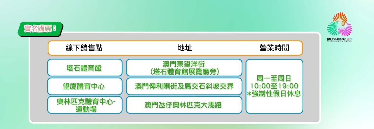 As lojas de venda presencial da zona de competição de Macau só terão bilhetes disponíveis para as competições locais. Esta venda de bilhetes implementará rigorosamente o sistema de nome verdadeiro. Para garantir a fluidez do processo, os interessados na compra de bilhetes devem preparar previamente o documento de identificação válido utilizado durante o registo da conta. Os residentes da China Continental devem apresentar adicionalmente o seu Salvo-Conduto de Ida e Volta para Hong Kong e Macau válido, e estar atentos ao período de validade do respetivo visto aquando da assistência aos eventos. A fim de conseguir um maior número de público para assistir aos jogos da 15.a edição dos Jogos Nacionais e Jogos Olímpicos Especiais para Deficientes, será implementada, de acordo com os regulamentos, uma medida de limite de compra. Para as modalidades mais populares como de ténis de mesa e de voleibol (feminino adultos), cada compra será limitada a 3 bilhetes por sessão e a 6 bilhetes por sessão para o karaté. Cada pessoa, por cada compra, pode adquirir, no máximo, bilhetes de duas sessões (independentemente da modalidade). Cada documento de identificação válido só pode adquirir um bilhete por sessão. Caso seja necessário adquirir mais bilhetes para a mesma sessão, deverão ser fornecidas ao mesmo tempo as informações dos documentos de identificação dos espectadores que satisfaçam as normas, bem como será necessário mostrar as cópias dos documentos de identificação dos respectivos interessados para efeitos de verificação.