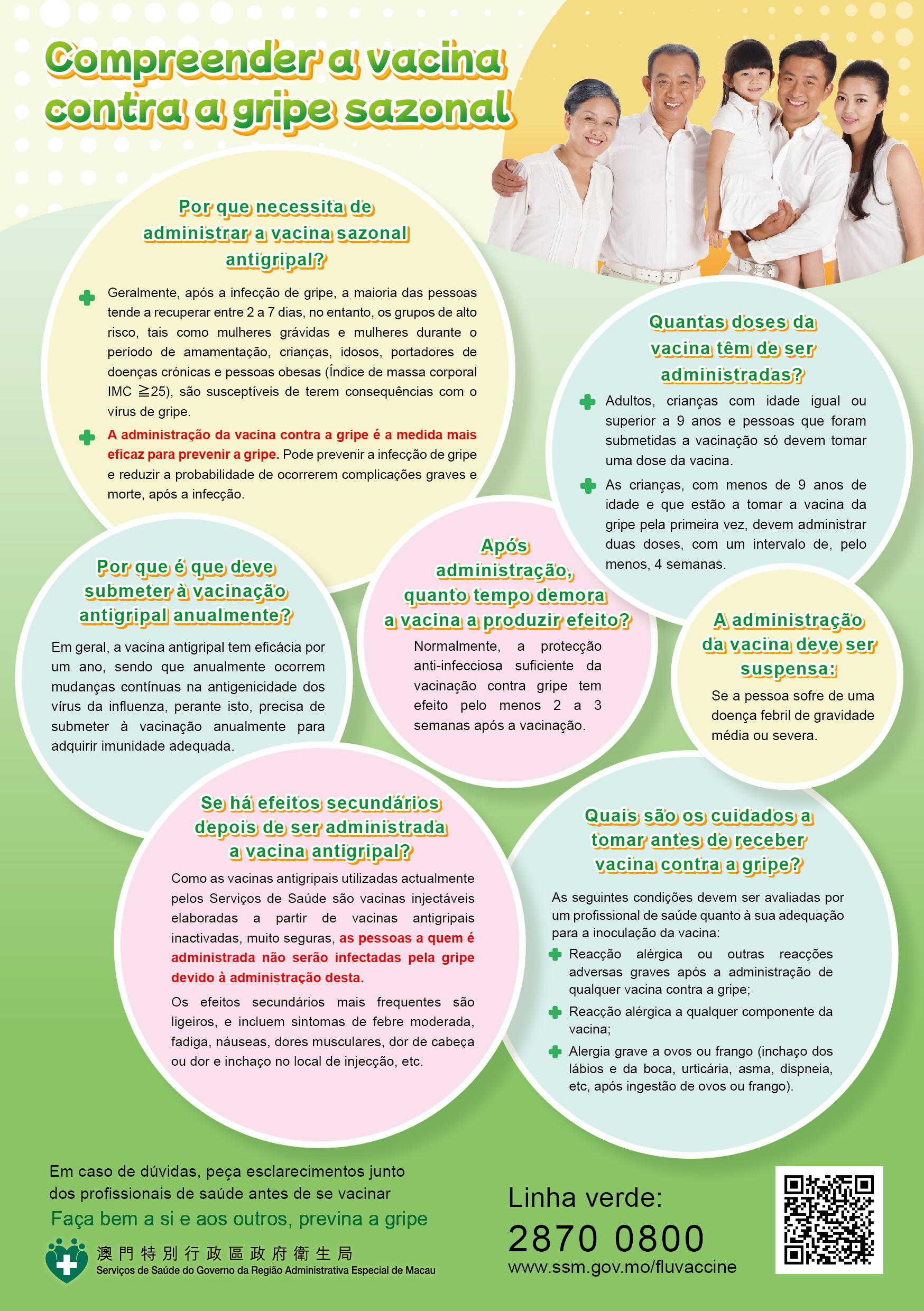 De acordo com os dados de monitorização das doenças semelhantes à gripe, a taxa de positividade de detecção do vírus influenza em Macau aumentou para 15% nos meados do mês de Setembro (de 14 a 20 de Setembro), ultrapassando o nível de alerta, o que mostra que o vírus influenza está relativamente activo. Neste contexto, os Serviços de Saúde salientam, mais uma vez que, o Outono e o Inverno são épocas de alta incidência de doenças respiratórias, prevendo-se um aumento da propagação do novo tipo de coronavírus e do vírus da gripe, e a vacinação antigripal pode reduzir eficazmente as consequências graves resultantes da infecção dupla do novo tipo de coronavírus e do vírus da gripe. Por isso, a fim de proteger a saúde dos indivíduos de alto risco, apela-se às grávidas, crianças, idosos e doentes crónicos, que são mais susceptíveis de sofrer complicações graves após a infecção do vírus da gripe, para que, antes do pico da gripe no Inverno, vacinarem-se com a maior brevidade possível contra a gripe sazonal.