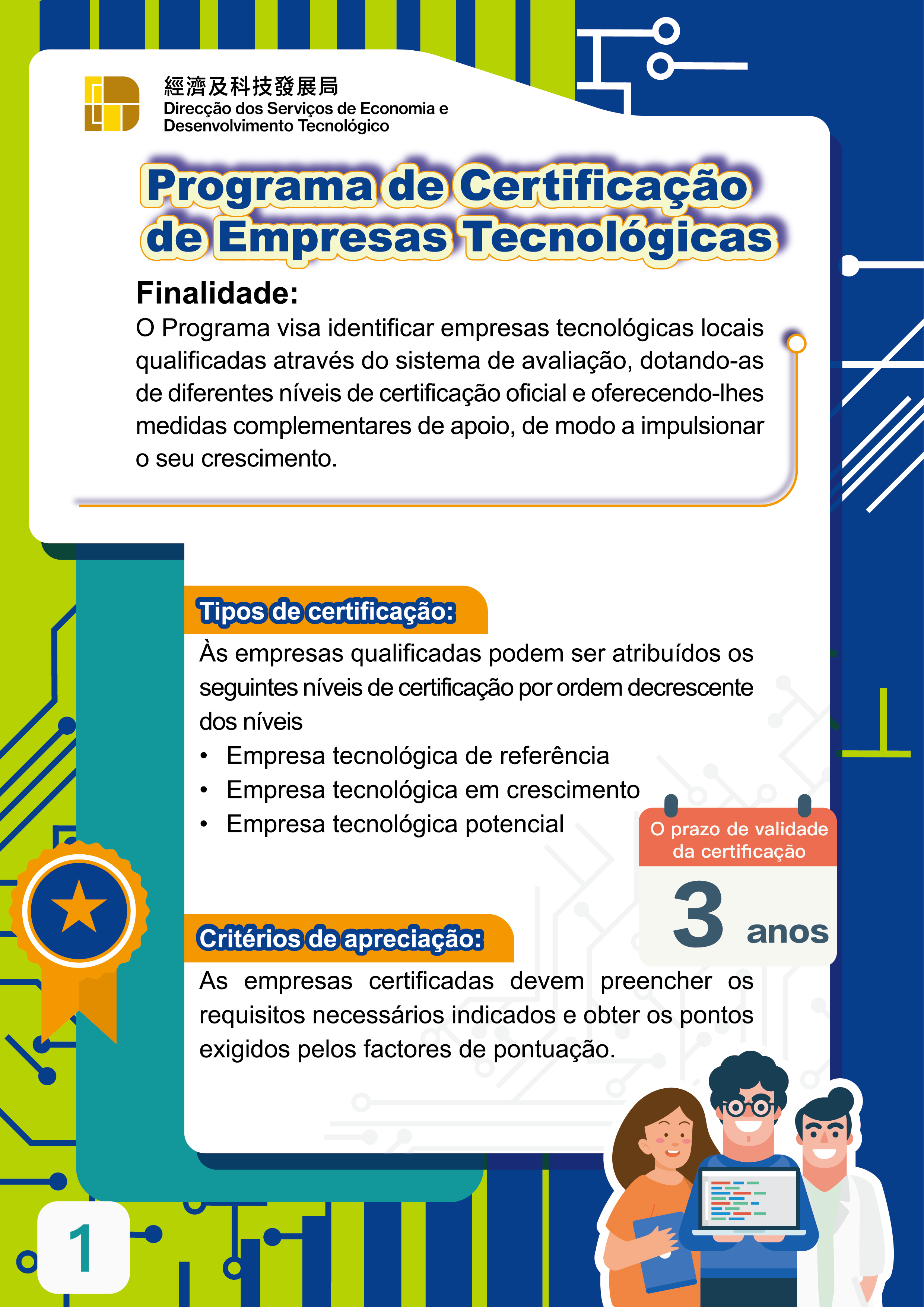 Em articulação com as estratégias de desenvolvimento da diversificação adequada «1+4» do Governo da RAEM e para aperfeiçoar empenhadamente o sistema e o ambiente político para o desenvolvimento da indústria científica e tecnológica, a Direcção dos Serviços de Economia e Desenvolvimento Tecnológico (DSEDT) continua a lançar o Programa de Certificação de Empresas Tecnológicas (Programa), visando identificar empresas tecnológicas locais qualificadas através do sistema de avaliação e construir uma escada de crescimento para empresas tecnológicas locais, de modo a ajudá-las a desenvolverem-se. Até à presente data, o Programa abriu cinco rondas de candidaturas, somando um total de 51 empresas tecnológicas locais que obtiveram a certificação, entre elas, 7 empresas tecnológicas de referência, 1 empresa tecnológica em crescimento e 43 empresas tecnológicas potenciais, abrangendo as suas actividades diferentes áreas como circuitos integrados, tecnologias de informação, medicina tradicional chinesa, novos materiais e biotecnologia.