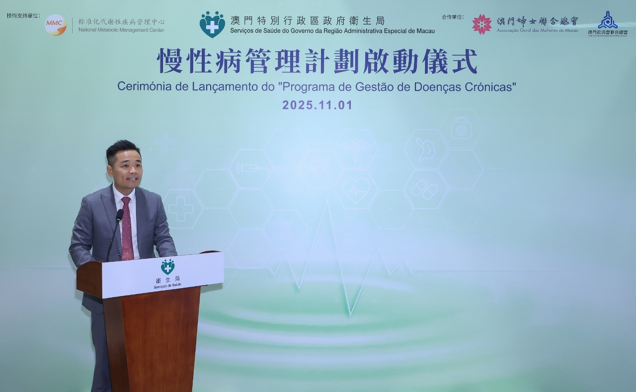 No discurso proferido durante a cerimónia, o Director dos Serviços de Saúde, Lo Iek Long, destacou que os Serviços de Saúde têm avançado no cumprimento do objectivo de "prevenção prioritária e do tratamento adequado", alinhando-se às orientações fundamentais do Presidente Xi Jinping acerca da "construção de um sistema de garantia de saúde que abranja todo o ciclo de vida". Sublinhou a necessidade de aprimorar continuamente o sistema de serviços médicos, fortalecer a formação dos profissionais de saúde e promover o bem-estar físico e mental da população em geral. As doenças crónicas constituem actualmente o principal desafio para a saúde dos residentes de Macau, sendo responsáveis por aproximadamente 80% do total de óbitos registados em Macau. Para alcançar a meta de uma "Macau Saudável", torna-se imprescindível efectuar a “mudança de paradigma” da gestão de doenças crónicas, transitando do modelo centrado na "terapia pós-doença" para uma abordagem focada na "prevenção e gestão precoce". O referido director espera que, até 2030, haja um aumento abrangente nas taxas de conhecimento, tratamento e controlo das doenças crónicas entre os residentes, o que contribuirá para a redução efectiva do risco de mortalidade relacionado a essas doen;as. Os Serviços de Saúde têm implementado diversas medidas preventivas e de controlo das doenças crónicas, incluindo o "Programa de Rastreio de Doenças Crónicas", que incentiva os residentes a utilizarem vales de saúde para a gestão comunitária da saúde. Nesse contexto, o número de postos de auto-medição na comunidade foi ampliado para 146, com o intuito de elevar a taxa de conhecimento sobre essas doenças. Ademais, foi instituído o "Sistema de Indicadores da Qualidade da Gestão das Doenças Crónicas", que, por meio da padronização dos critérios diagnósticos e terapêuticos, visa promover a melhoria contínua da capacitação profissional do pessoal médico de base, resultando em um aumento significativo na taxa de controlo dos pacientes com diabetes e hipertensão. Por fim, o director ressaltou que a implementação do "Programa de Gestão de Doenças Crónicas", em parceria com associações locais, representa uma medida crucial para a efectivação da política governamental de descentralização dos recursos da Região Administrativa Especial de Macau (RAEM). Com o apoio da rede de serviços comunitários dessas associações para sua execução, o desvio dos pacientes com doenças crónicas em estado estável para atendimento em consultas externas comunitárias para gestão colaborativa, pode, simultaneamente, reduzir a sobrecarga dos serviços oferecidos pelas instituições médicas públicas e possibilitar que os residentes tenham acesso a serviços de gestão de saúde de qualidade e continuidade no âmbito comunitário. Ademais, tal prática contribui para o desenvolvimento sustentável do sistema de saúde.