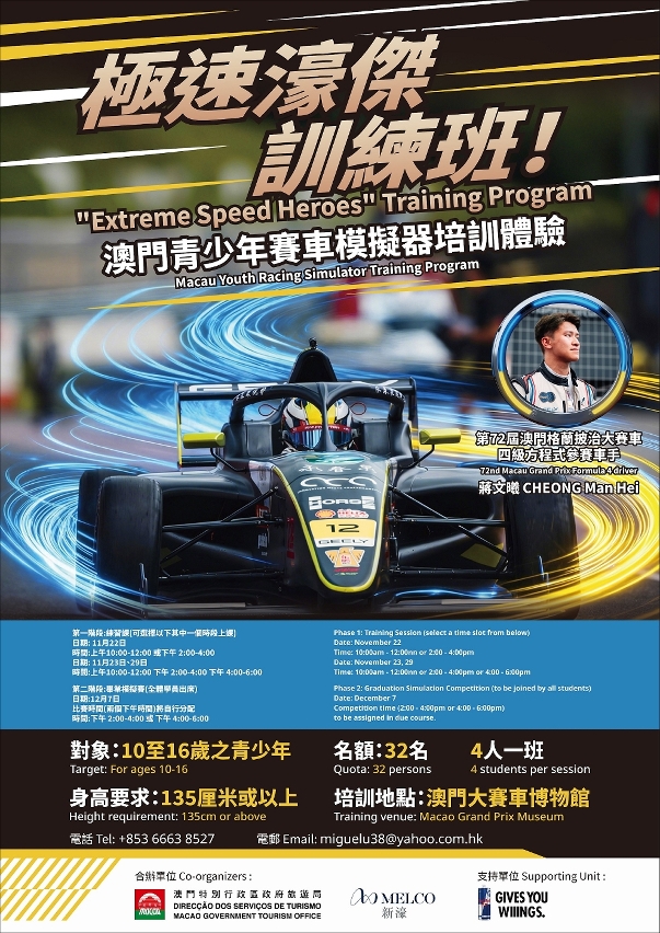 O programa de formação “Heróis de Velocidade Extrema” divide-se em suas fases. A primeira fase de treinos de simulação de corridas terá lugar nos dias 22, 23 e 29 de Novembro e a segunda fase, sessão de simulação de competição de final de curso, terá lugar no dia 7 de Dezembro. O piloto de Macau actualmente na Fórmula 4 e vencedor por sete anos consecutivos do Campeonato de Karting da categoria KZ, Marcus Cheong, orientará os participantes na aprendizagem das técnicas de condução do simulador do Grande Prémio de Macau.