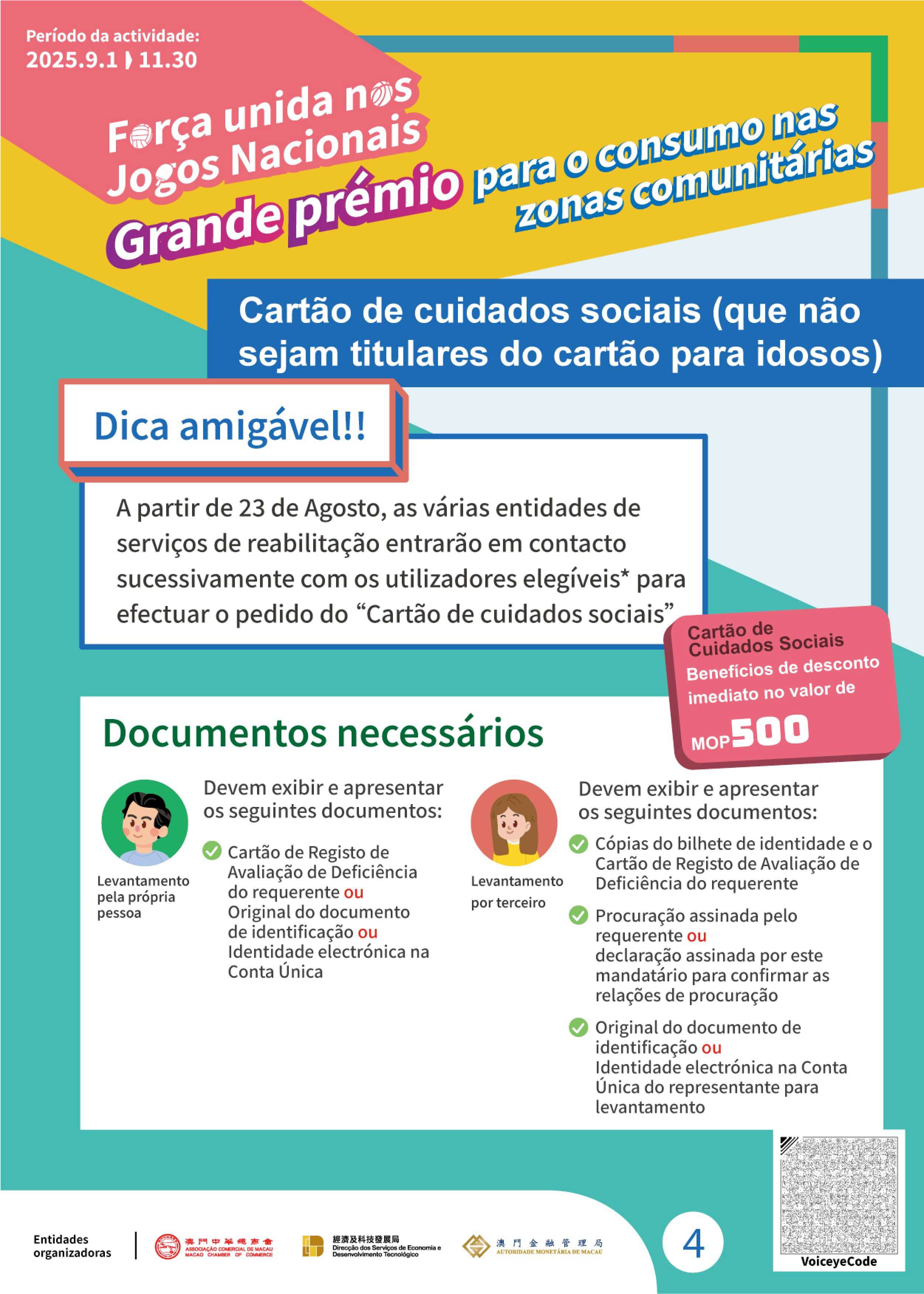 Os titulares do Cartão de Registo de Avaliação da Deficiência podem apresentar o seu cartão em instituições e centros coordenados pelo Instituto de Acção Social (IAS) para levantar o Cartão de Cuidados Sociais com 500 patacas em benefícios de desconto imediato. Para prestar serviços de requerimento mais conveniente ao público, a DSEDT e o IAS coordenaram mais de 40 instituições de serviços de reabilitação para ajudar os mesmos a requererem o cartão. Dos restantes titulares do Cartão de Registo de Avaliação da Deficiência podem levantar nos 5 centros de acção social e no Centro de Avaliação Geral de Reabilitação do IAS.