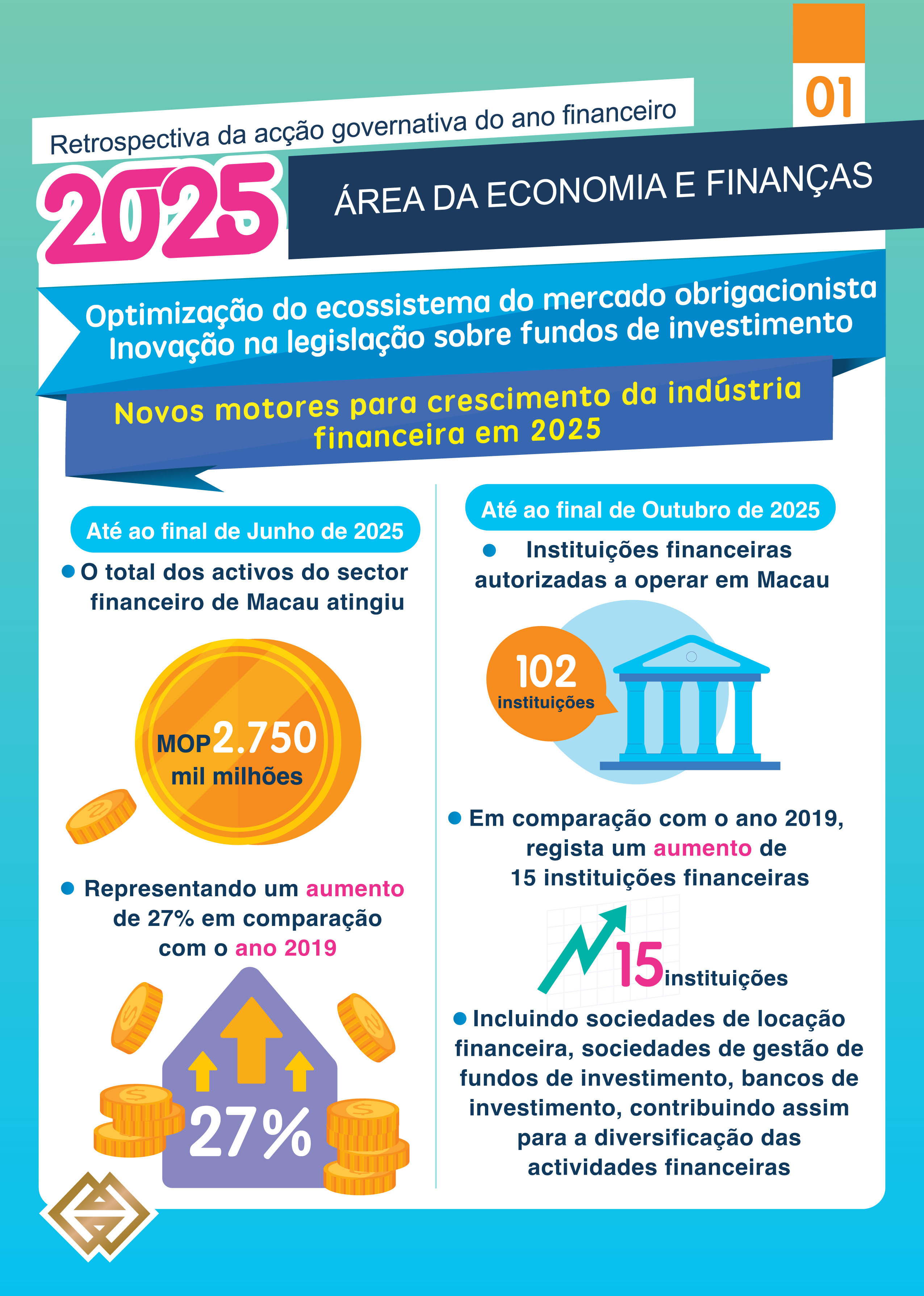 Para implementar as politicas, definidas no Relatório das Linhas de Acção Governativa para o Ano Financeiro de 2025, que visam promover de forma sustentada o desenvolvimento qualitativo do sector financeiro moderno, a Autoridade Monetária de Macau (AMCM), assente no reforço do controlo dos riscos financeiros e na manutenção da solidez do sistema financeiro, tem vindo a dedicar-se à expansão do espaço de desenvolvimento de novos sectores financeiros, designadamente o mercado obrigacionista e fundos de investimento, e ao aperfeiçoamento do quadro geral e do respectivo enquadramento legal, de modo a promover a transformação do sector através da inovação e fomentar novos motores de crescimento.