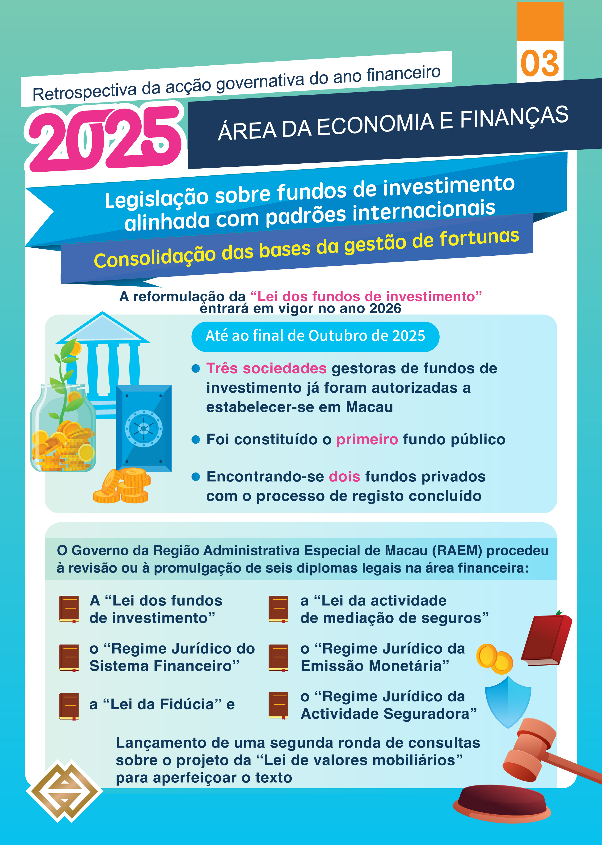 Para impulsionar o desenvolvimento do mercado de gestão de fortunas, o Governo da RAEM promulgou, em Julho deste ano, a nova versão da “Lei dos fundos de investimento”, que entrará em vigor no próximo ano. A nova lei visa reforçar o alinhamento com os sistemas de supervisão internacionais, aumentar a protecção dos investidores, alargar a diversidade de instrumentos de investimento, eliminar obstáculos à operação e desenvolvimento da gestão de fundos e optimizar o ambiente para o investimento e gestão de fundos. Actualmente, estão registadas três sociedades gestoras de fundos de investimento autorizadas a estabelecerem-se em Macau, tendo sido constituído o primeiro fundo de oferta pública em Macau, e encontrando-se dois fundos de oferta privada com o processo de registo concluído.