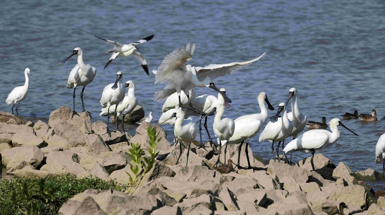 • Os colhereiros-de-cara-preta que vêm passar o Inverno em Macau estão activos nas Zonas Ecológicas.