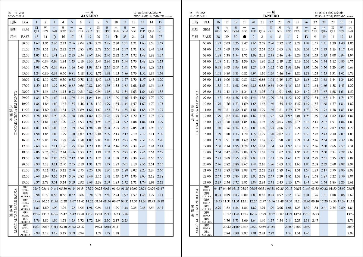 A “Tabela de Marés 2026”, produzida pela Direcção dos Serviços de Assuntos Marítimos e de Água (DSAMA), já se encontra disponível no site oficial www.marine.gov.mo. Para um acesso rápido, o público pode digitar “Tabela de Marés” na caixa de pesquisa do site ou navegar para “Gestão marítima>Segurança marítima> Publicações”, onde poderá consultar e descarregar a Tabela de Marés.