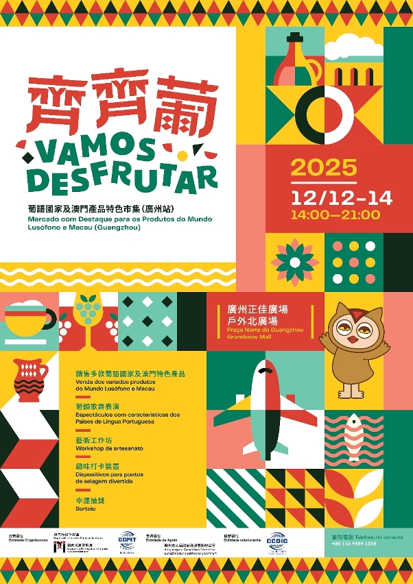 Com o intuito de criar uma plataforma de promoção e venda de produtos característicos dos países de língua portuguesa e de intercâmbio cultural, e de mostrar o rico e diversificado encanto do comércio sino‑lusófono de Macau, a edição de 2025 do “Vamos Desfrutar – Mercado com Destaque para os Produtos do Mundo Lusófono e Macau” (Estação de Cantão) terá lugar de 12 a 14 de Dezembro (sexta a domingo) na praça exterior norte do Grandview Mall, em Cantão. Esta será a primeira vez que o evento se realiza em Cantão, depois de Hengqin, e contará com a participação de 26 pequenas e médias empresas de Macau, que irão expor e vender mais de 200 produtos característicos dos países de língua portuguesa e de Macau. No local haverá actuações de artistas lusófonos e múltiplos workshops artísticos, com ofertas limitadas e sorteios imediatos.