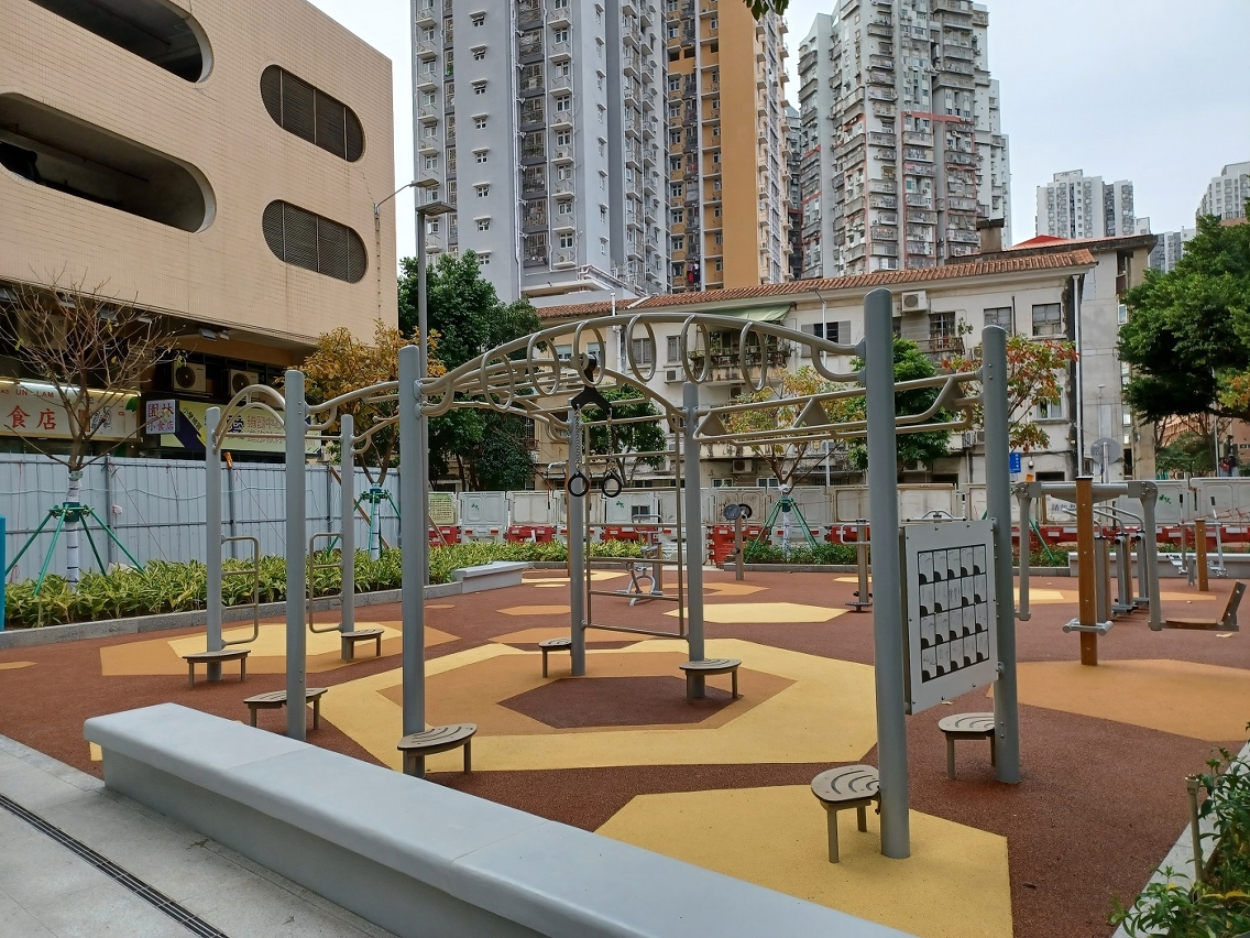 A Zona de Lazer da Rua Central de T'oi Sán tem uma área de 870 metros quadrados, integrando elementos naturais e preservando as árvores existentes no local. Em harmonia com a paisagem arborizada, oferece aos utentes diversão num oásis urbano. Tendo em conta a alta taxa de utilização do local por parte dos encarregados de educação e das crianças nas escolas próximas, foi dada prioridade à actualização da zona de diversão infantil e da zona de manutenção física para adultos e à adição de equipamentos personalizados para crianças em formato de casa na árvore e instalados trilhos aéreos de aventuras, aproveitando plenamente o espaço limitado para proporcionar aos jovens e crianças um local de diversão, de exploração da natureza e de treino do senso de coordenação e equilíbrio, com vista a aumentar a sua capacidade física. Ao mesmo tempo, foi levado a cabo um novo planeamento da disposição e optimizadas as instalações da zona de manutenção física para adultos, em resposta às necessidades de actividades físicas e recreativas por parte de diferentes faixas etárias.