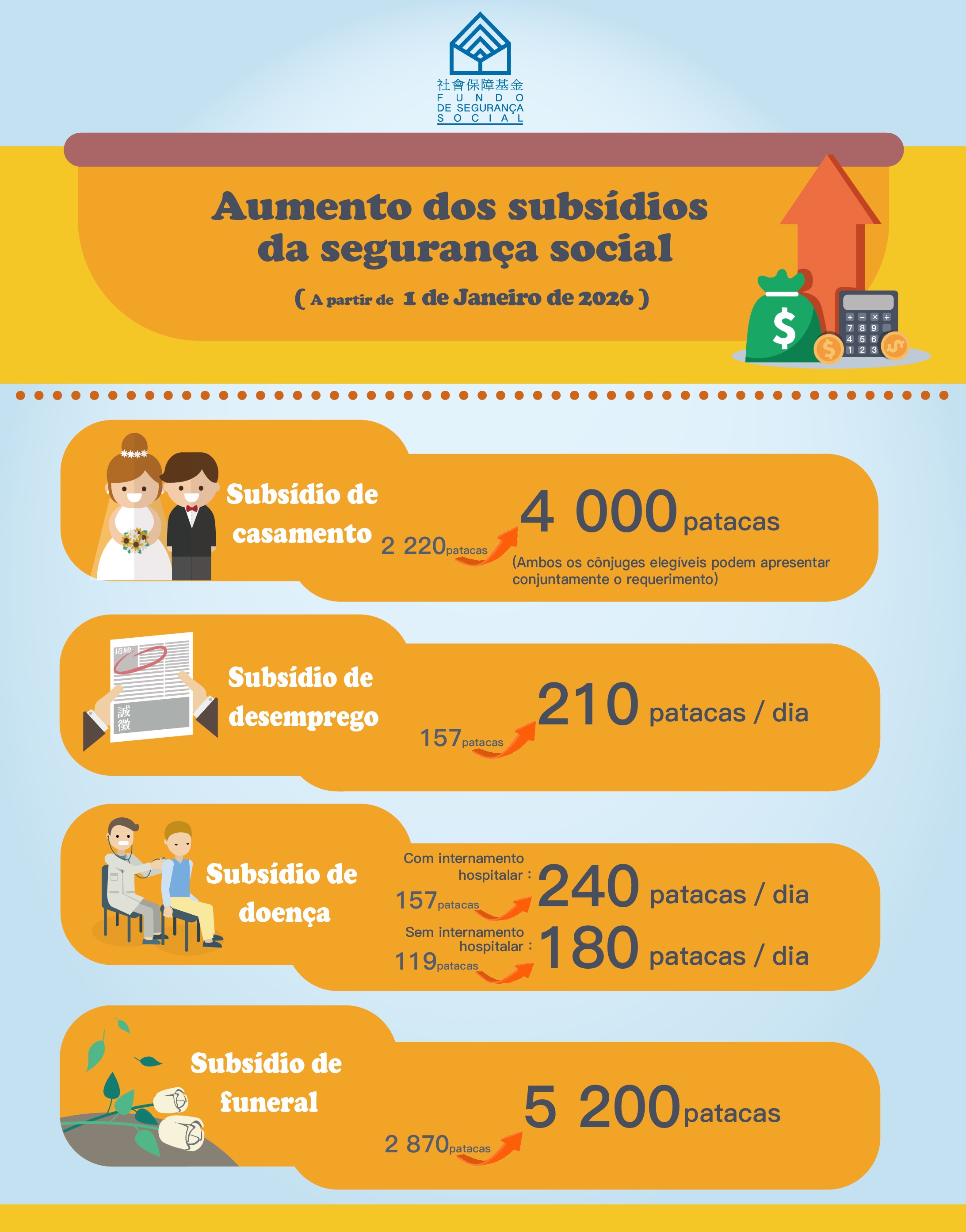 O regime da segurança social funciona como protecção básica ao longo do ciclo de vida dos residentes, demonstrando solidariedade para com os residentes que enfrentam momentos importantes da vida e prestando assistência aos residentes que enfrentam situações de risco imprevisto. A partir de 1 de Janeiro de 2026, serão aumentados os montantes de quatro subsídios. Após o aumento, o montante do subsídio de casamento passará de 2.220 patacas para 4.000 patacas, podendo ser requerido por ambos os cônjuges qualificados. O montante do subsídio de desemprego aumentará para 210 patacas por dia, o do subsídio de doença com internamento hospitalar para 240 patacas por dia, o do subsídio de doença sem internamento hospitalar para 180 patacas por dia e o do subsídio de funeral para 5.200 patacas.