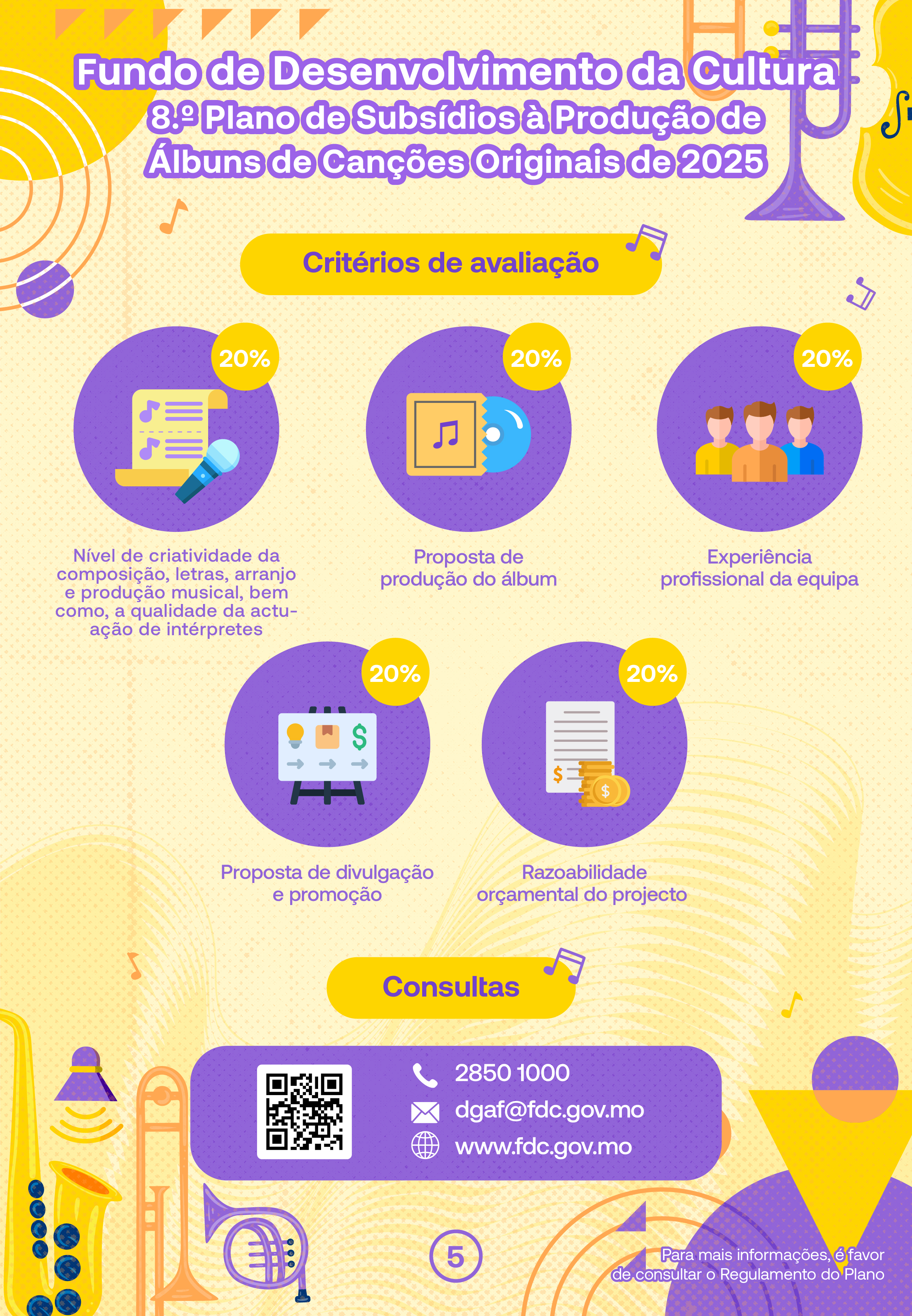 O Fundo de Desenvolvimento da Cultura (FDC) lança o “8.º Plano de Subsídios à Produção de Álbuns de Canções Originais”, com o objectivo de cultivar os talentos musicais locais, impulsionar o desenvolvimento da indústria musical de Macau e proporcionar aos criadores oportunidades para lançarem canções originais, apoiando ainda a acumulação de obras excelentes e a expansão do mercado, através da prestação de apoio financeiro às despesas de produção da canção, design da capa, distribuição e promoção, bem como, fornecimento do aconselhamento profissional.