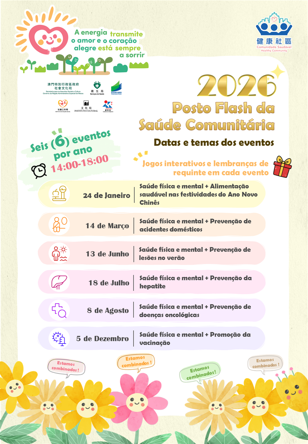 No âmbito da promoção contínua do programa “Comunidade Saudável”, os Serviços de Saúde, em colaboração com associações com experiência na promoção da saúde mental nos bairros comunitários, nomeadamente a Cáritas de Macau, a Associação Richmond Fellowship de Macau, a Associação dos Jovens Cristãos de Macau, o Serviço Social Baptista Oi Kwan de Macau e o Gabinete Coordenador dos Serviços Sociais Sheng Kung Hui de Macau, realizarão cinco sessões do “Posto Flash da Comunidade Saudável” nos meses de Março, Junho, Julho, Agosto e Dezembro do corrente ano. Cada sessão possui um tema distinto e incorpora componentes de saúde física e mental, caracterizando-se por uma metodologia móvel e flexível, que facilita a disseminação de informação científica e prática sobre saúde, contribuindo para o bem-estar físico e mental dos residentes.