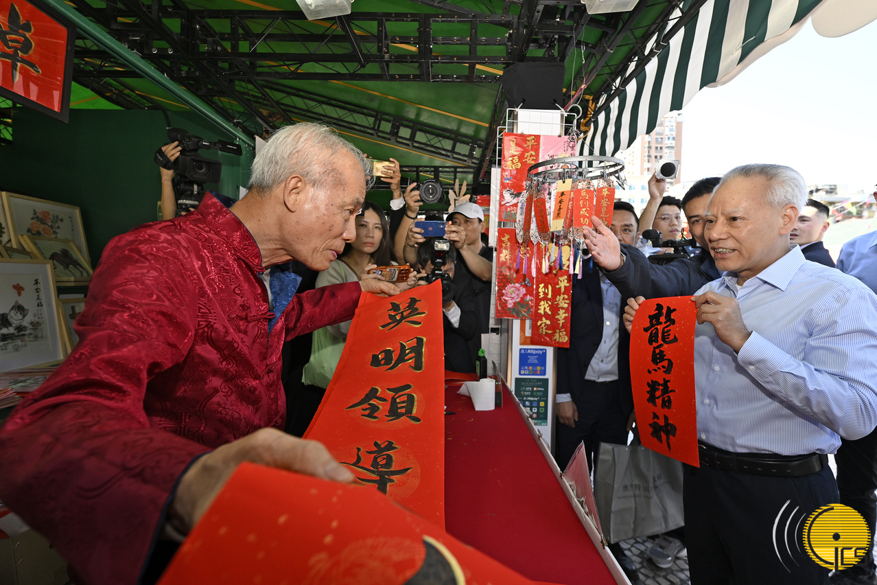 Na tenda de venda de papéis votivos (Fai Chun), o vendedor, a pedido do Chefe do Executivo, escreveu um papel votivo de muita saúde, com traços vigorosos e auspiciosos. O Chefe do Executivo comprou o papel votivo, aproveitando-o para desejar à população de Macau muita saúde, vitalidade e alegria no novo ano. Para além do papel votivo, adquiriu ainda vários produtos e flores festivos. Sam Hou Fai e a esposa desejaram aos vendedores das bancas prosperidade para os negócios, conversaram cordialmente com a população e turistas, tirou fotografias, assim como interagiram alegremente, partilhando o ambiente festivo.