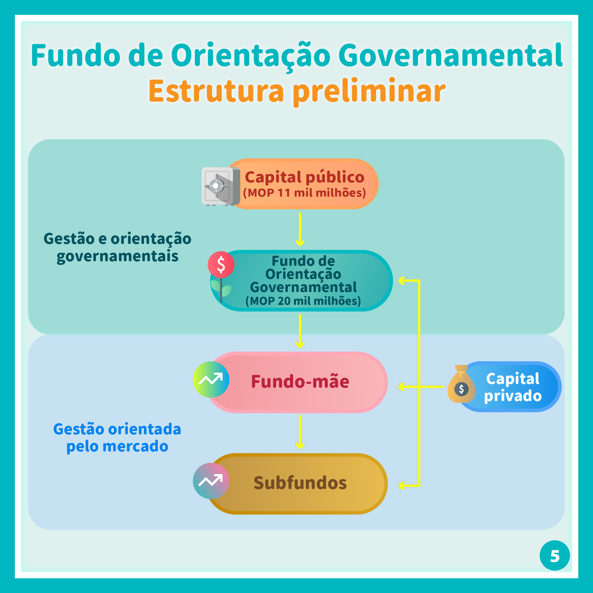 O Governo envidará esforços para concluir, no decurso do corrente ano, a constituição do Fundo, de modo a dar início ao procedimento de selecção dos gestores de fundos. Em paralelo, serão promovidos os trabalhos de constituição da entidade gestora e a promulgação de regulamento administrativo e de diplomas complementares que enquadrem o funcionamento do Fundo de Orientação Governamental, bem como o arranque de mecanismos de comunicação e concertação com os investidores dos capitais privados da primeira fase, na expectativa de os orientar na reacção e participação nos investimentos industriais prioritários do Governo da RAEM, promovendo em conjunto a diversificação adequada da economia de Macau e abrindo um novo marco no desenvolvimento de alta qualidade.