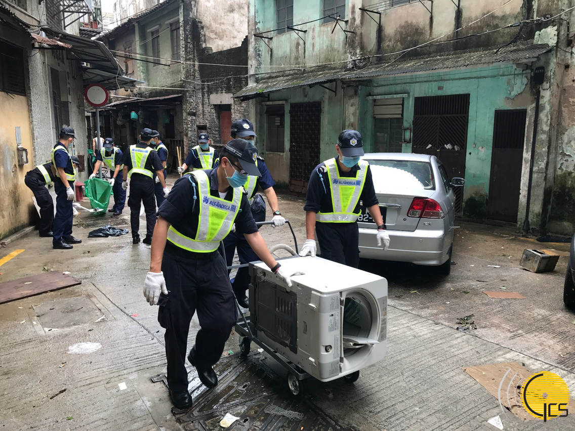 保安部队及部门人员与街坊同心协力,持续清理街道杂物,以期尽快恢复市容。
