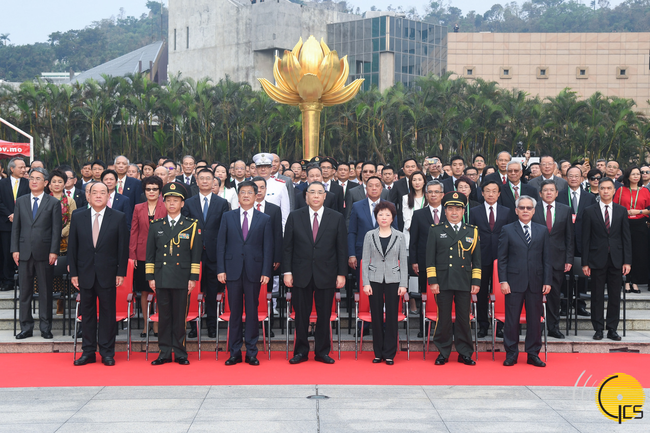 行政长官、特区主要官员、中央驻澳官员、解放军驻澳部队军官及各界人士出席庆祝中华人民共和国成立69周年升旗仪式。