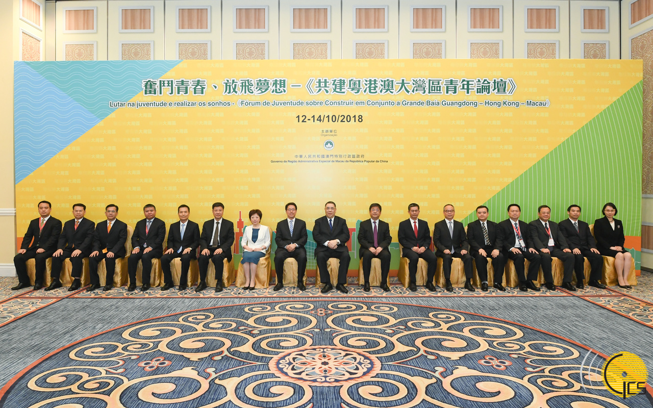 行政长官崔世安与来澳出席“奋斗青春、放飞梦想—共建粤港澳大湾区青年论坛”的嘉宾及大湾区城市政府领导合影。