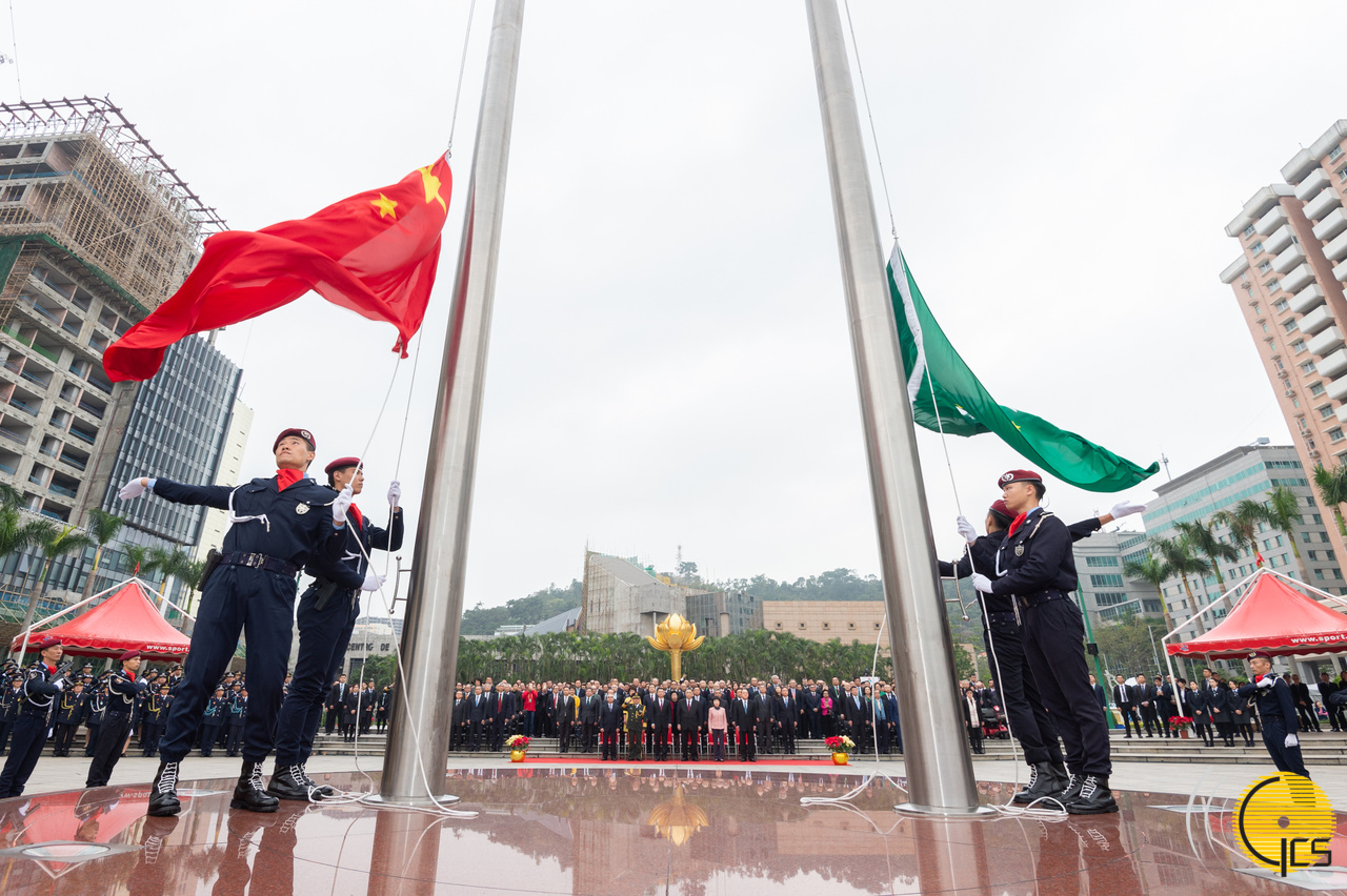 行政长官、特区主要官员、中央驻澳官员、解放军驻澳部队军官及各界人士出席庆祝中华人民共和国澳门特别行政区成立十九周年升旗仪式。