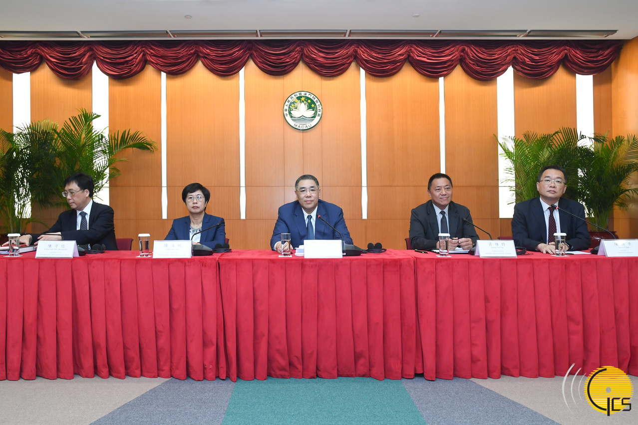 政府发言人办公室举行新闻发布会,就政府向立法会要求删除引介、一般性讨论及表决《修改二零一九年财政年度财政预算》法案与《修改第11/2009号法律〈打击电脑犯罪法〉》法案两项议程之事宜进行说明,行政长官崔世安、行政法务司司长陈海帆、经济财政司司长梁维特、政府发言人陈致平以及金融管理局行政委员会主席陈守信出席发布会。