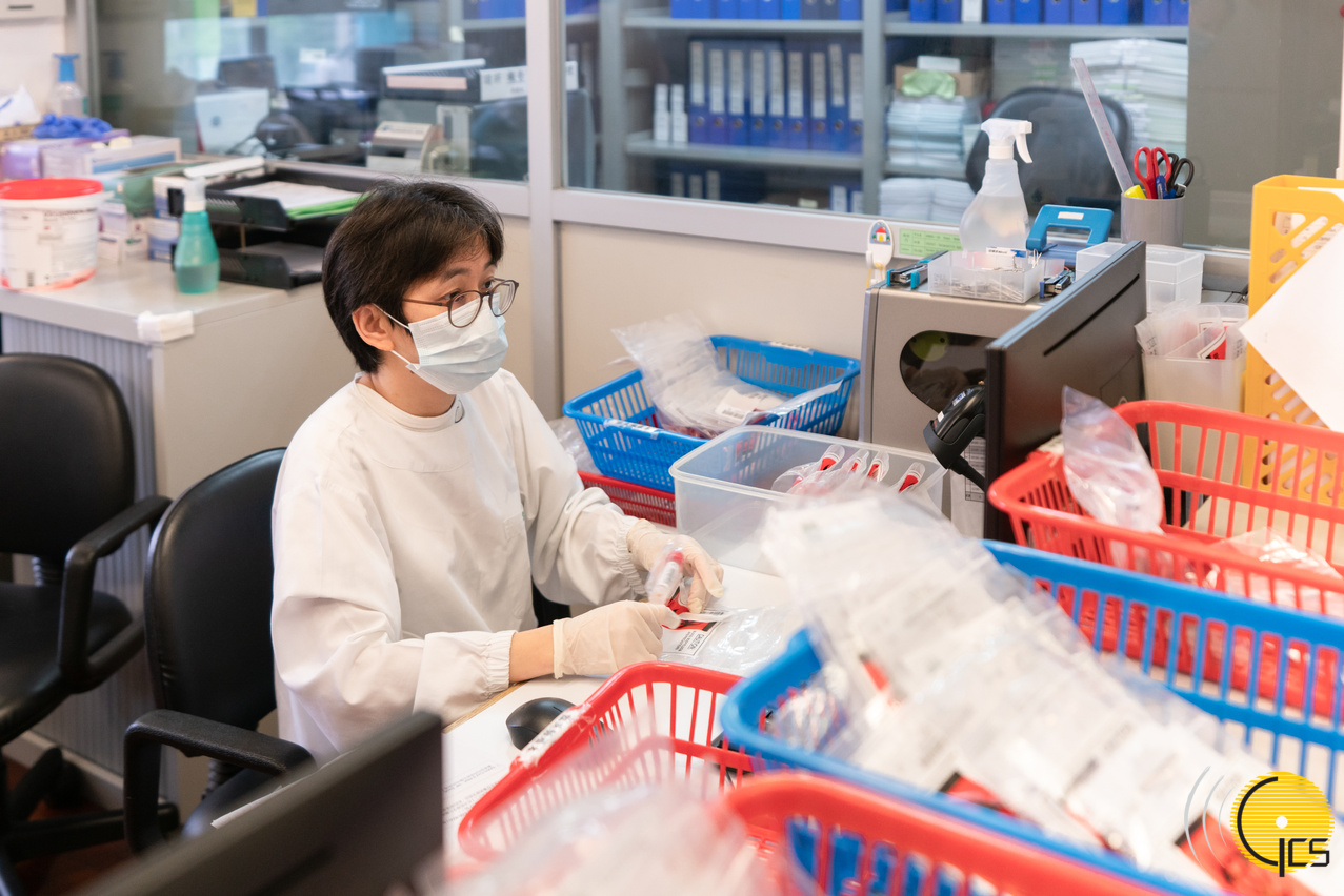 工作人员正核对样本资料、标贴样本编号。化验所负责及协助核酸检测的工作人员约30人。针对核酸检测已将办公时间调整至早上8时到晚上10时。目前每日核酸检测量平均超过1,000人次。