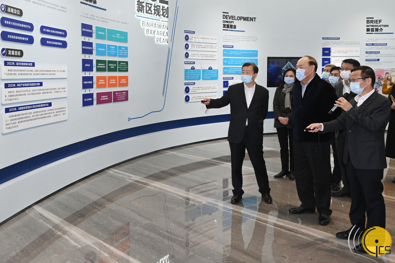 在东莞市访问的行政长官贺一诚,第二站考察滨海湾新区,先到滨海驿站了解新区的规划及建设情况,之后再到滨海湾新区展示中心,听取东莞市滨海湾新区党工委书记罗斌的介绍。
