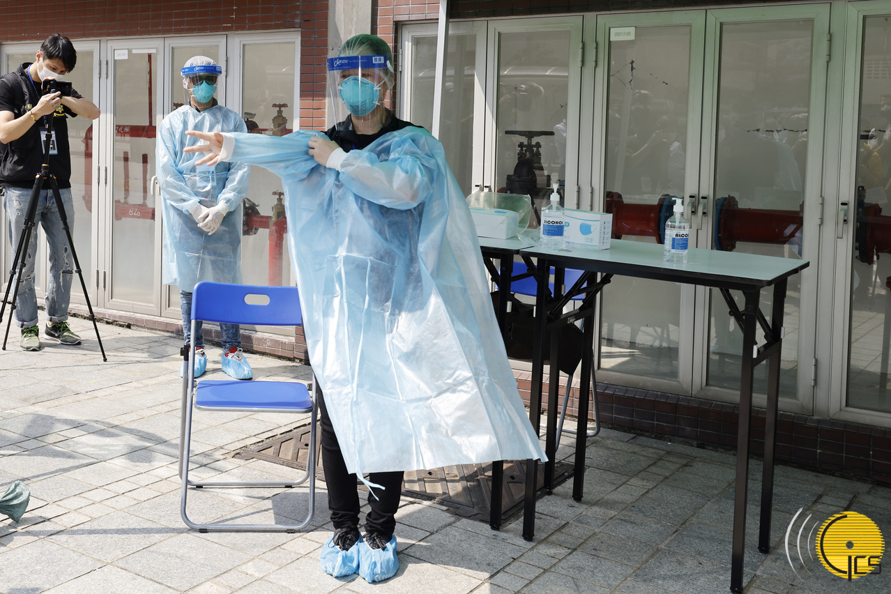 "分区分级精准防控"实地演习-工作人员于"穿着区"穿着防护衣