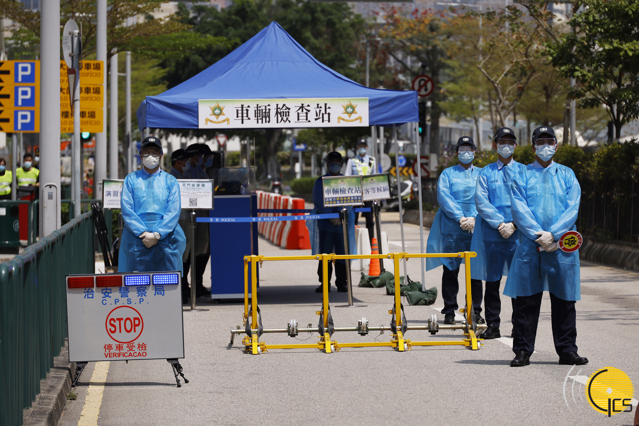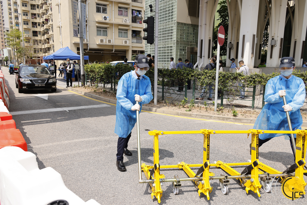 "分区分级精准防控"实地演习-治安警察局人员在红码区设检查点,为工作人员及巿民作进出管理。