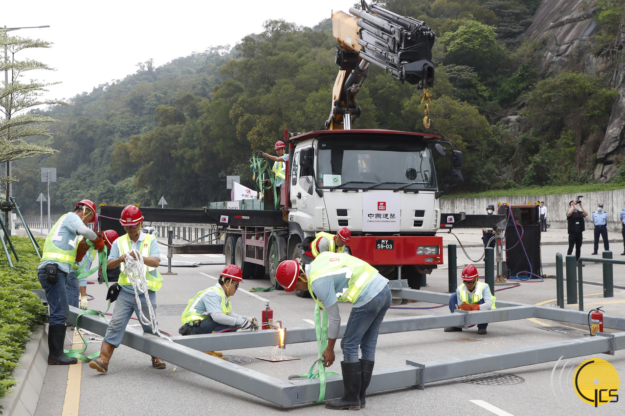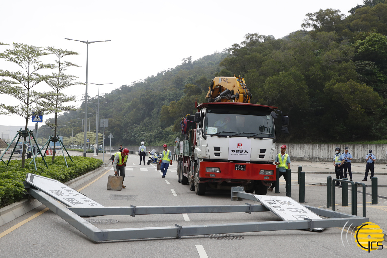 “水晶鱼2023”台风演习-治安警察局协调建筑工程公司工程车及人员到场移走阻碍主干道路的大型路牌。