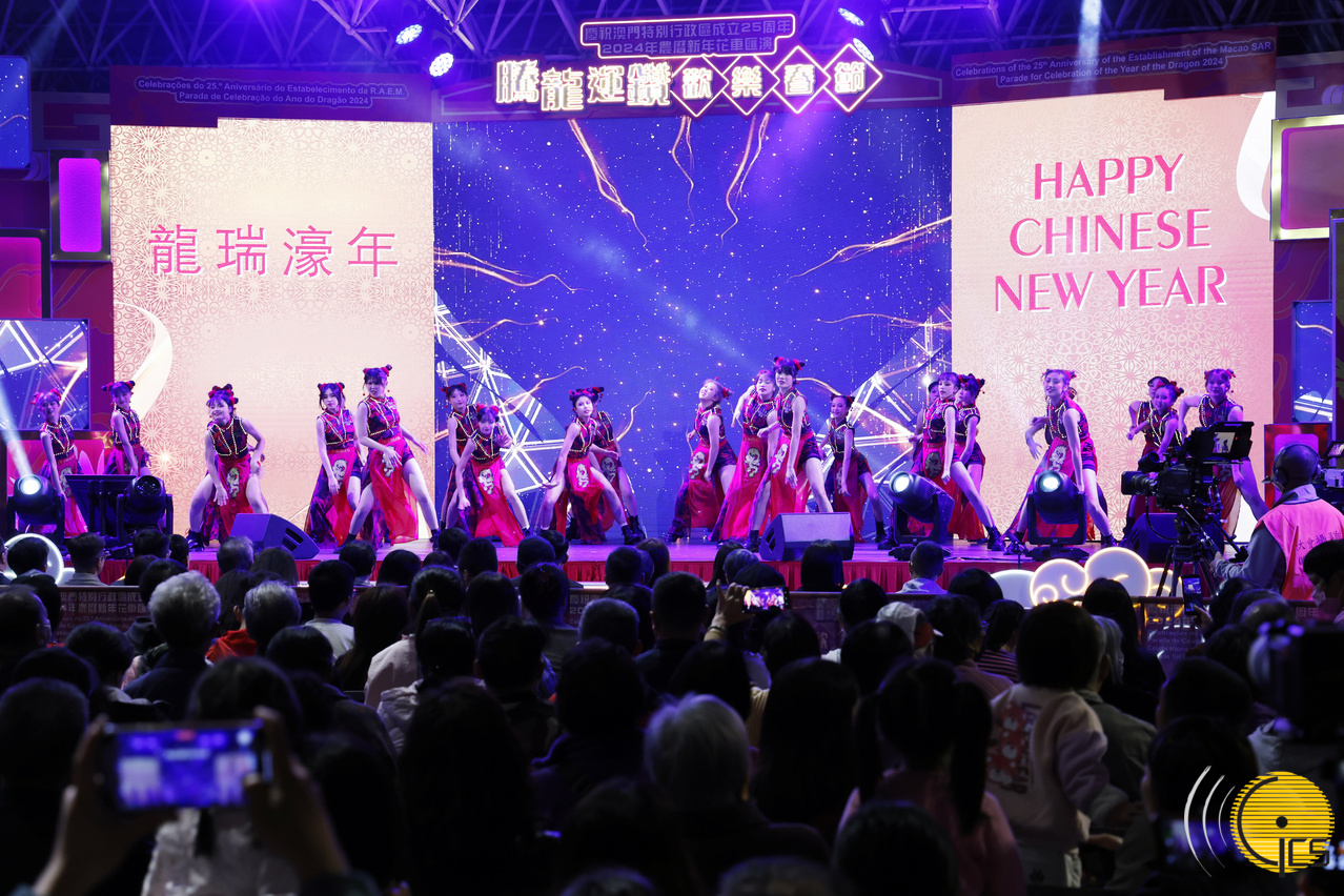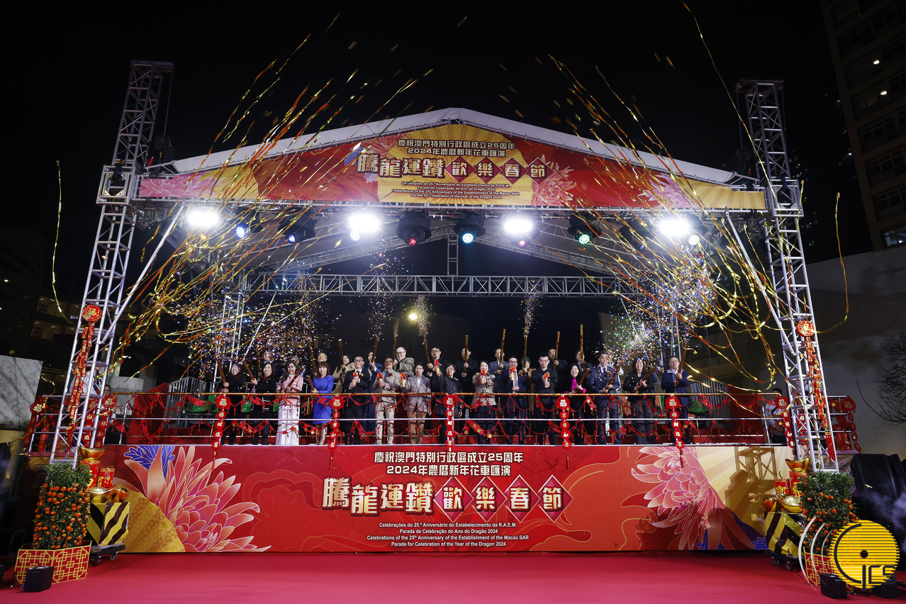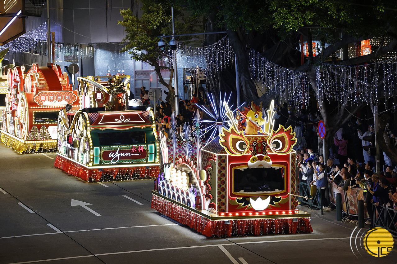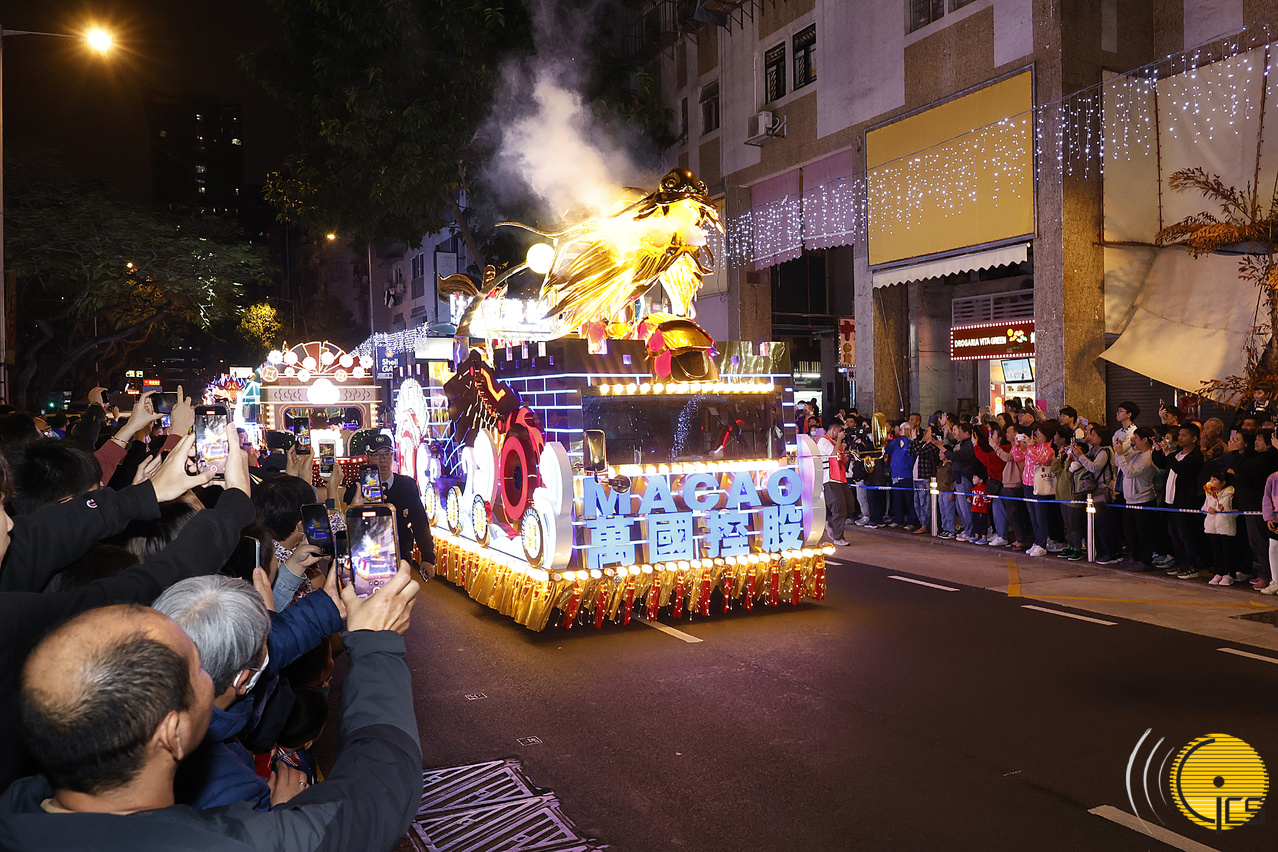“庆祝澳门特别行政区成立25周年 2024年农历新年花车汇演 腾龙运钻欢乐春节”第二场花车巡游于圣若瑟大学及圣若瑟教区中学第六校起步。