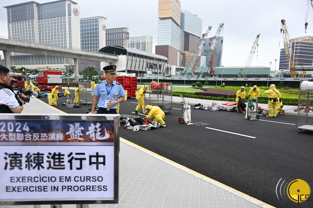 2024年大型联合反恐演练“盘龙” - 消防局及解放军驻澳部队人员对会场进行洗消。
