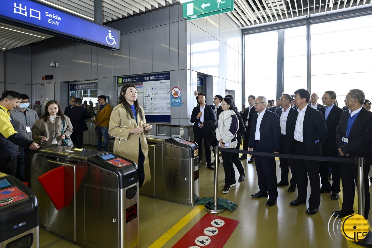 行政长官岑浩辉在轻轨东亚运站实地了解疏导观众离开的交通应变安排。
