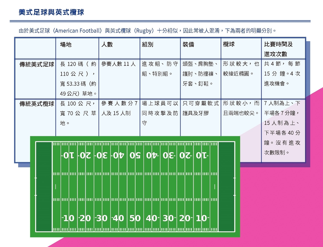 对传统美式足球(又称美式橄榄球)的印象,大多源于荷李活电影或电视剧集,一班穿上厚重保护装备的彪形大汉,在场上抱着橄榄球你攻我抢,飞奔脚踢,加上观众的狂呼喝采,看得人热血沸腾!虽然传统美式足球是现今美国最受欢迎的运动项目之一,但碍于有不少碰撞,未必适合所有人参与,为了更易于推广此项运动,腰旗美式足球(Flag Football又称夺旗式美式足球)应运而生。