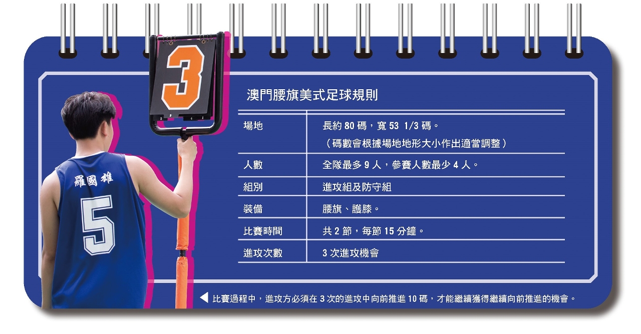 传统美式足球需要在一个长120码,宽53.33码的草坪球场上进行。澳门由于场地的局限,只好因地制宜发展腰旗美式足球。方登慧介绍,腰旗美式足球是从传统美式足球简化而来的大众化运动,两者规则与技巧相似,主要供当地的青少年参与。「与传统美式足球相比,腰旗美式足球的冲撞较少,规则亦相对简单。为了更易于在青少年间进行推广,我们还根据澳门的场地大小,对比赛规则作出适当的调整。」