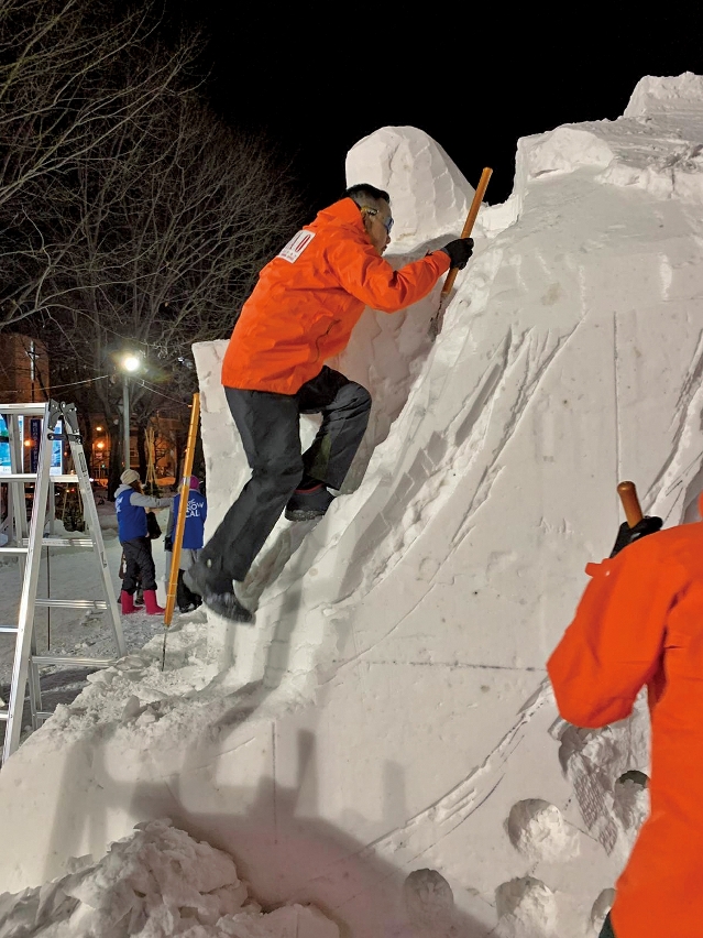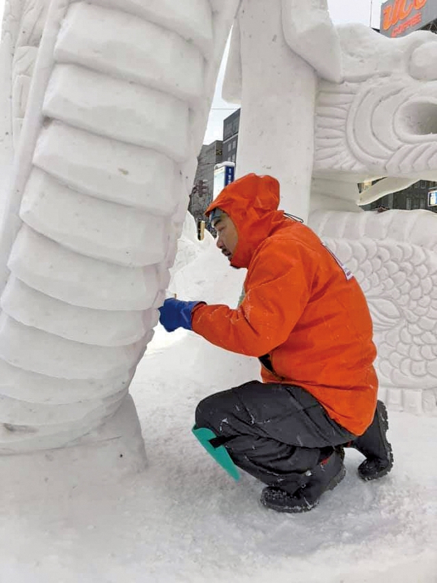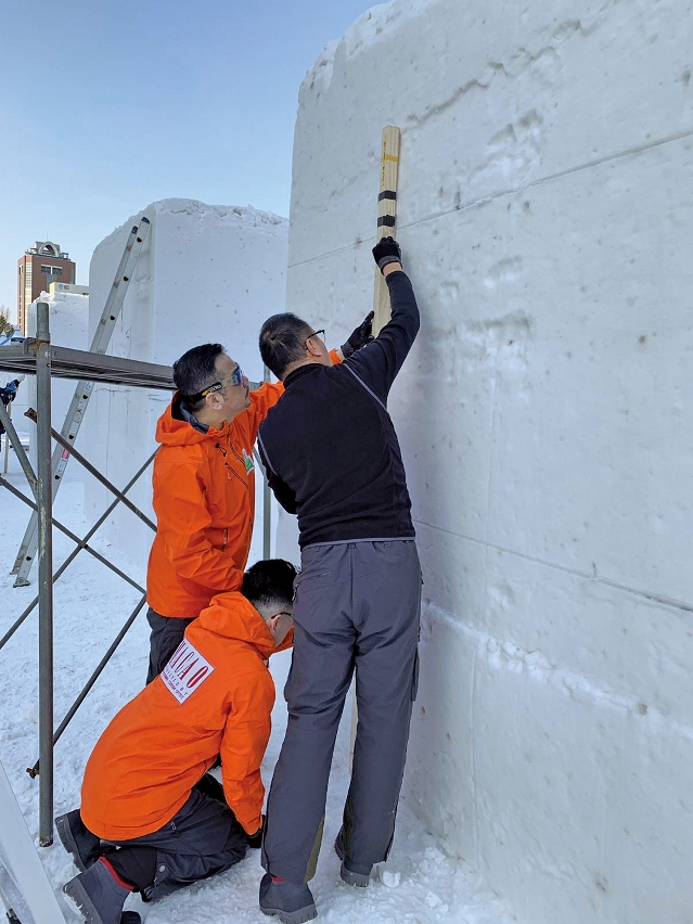 要创作出完美的雪雕作品,除了花心思设计,前期的准备工作亦不能马虎。阮锦鸿指出,每次比赛前,都会根据赛事要求及天气状况,才决定作品的类型。当中最难预测的是天气,亦是成败关键之一。「如果在比赛途中下大雪,就会遮盖作品的细节,必须重新雕刻。最麻烦的是太阳天,阳光的温度会使雪雕的内部融化,即使外表看似完好无缺,但其实一碰便会塌下来」。