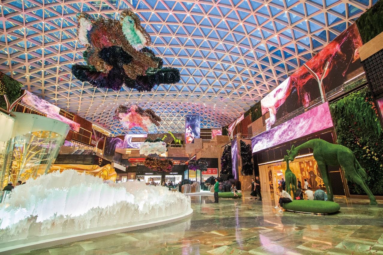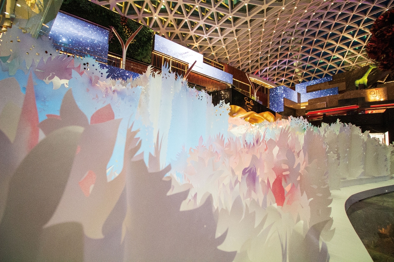 《蜕变:无穷尽》以马文的标志性蜂巢结构纸雕为核心,利用先进镭射技术制作的中国传统手工纸拉花,由墙壁、地面,一直蔓延到广场之中,在日与夜的不同灯光下,展现出如水墨的多样性,形成一幅巨大的立体山水作品。至于挂于天花下的神奇生物,则由多层复杂的镭射刻纸结构组成,远看犹如正在化开的书法墨迹,不禁令人联想到从花园中飞向天际的蝴蝶,正冲破那偌大的天幕「破茧而出」,一语道出作品所探讨的蜕变之意。