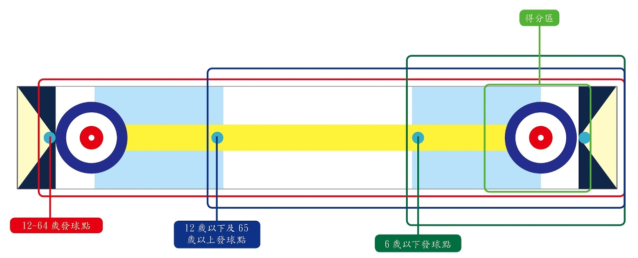 地壶球运动强调共融,为使不同年龄层及不同体能人士均能参与,赛道特别设立12至64岁、12岁以下及65岁以上、6岁以下3个不同的发球点。若赛队混合不同年龄队员参赛,球队须安排在较前位置发球的队员先发球。