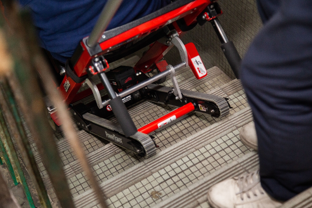 「上落出行服务」使用流程简单,有需要的人士提早3日预约,对于首次使用该服务的人士,工作人员会提前上门测量使用者居住单位的楼梯是否便于楼梯机通行。使用上或落楼服务,每程收费30元;领取援助金者,每程服务费用仅为10元。为照顾不同人士及楼宇设计,「上落出行服务」特设两款楼梯机,一种为「撑杆式楼梯机」,座椅下的机械部件以撑杆方式一级一级上下移动,一名工作人员便可操作,虽较方便但所用的空间、时间较多;另一种为「履带式楼梯机」,座椅下如坦克车的履带拾级而上,非常快捷,但唐楼梯级或有高低不平,履带较难平衡,需要两名工作人员操作以策安全。