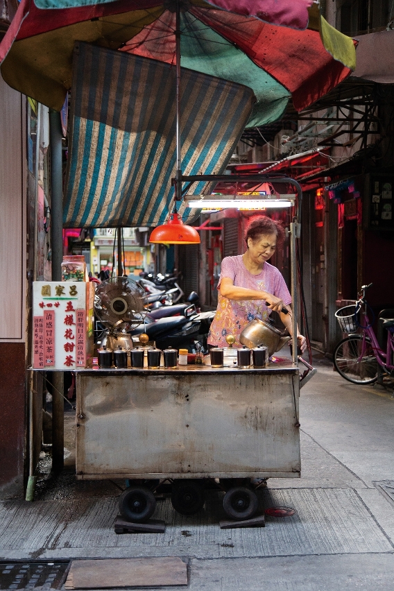 采访之时,突然下起滂沱大雨,王平赶紧将大伞撑起来,刚好遮住他爱惜的手推车。他说这辆车子已经陪伴了他三十多年,一开始摆檔就是这辆手推车,有感情了。急忙避雨的路人行色匆匆,王平依旧淡定地在大伞下整理茶壶茶杯,一丝不苟地将溅洒到车身上的雨水擦干。