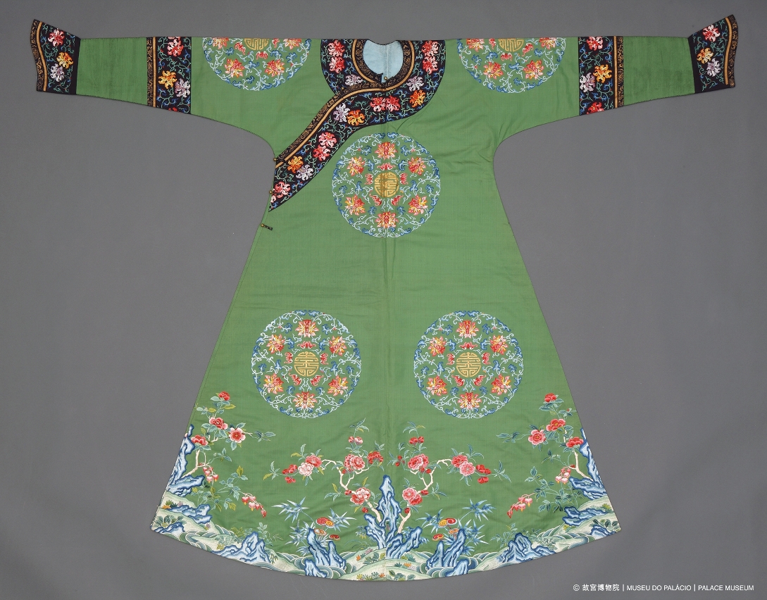 此袍为清代后妃吉服之一,主要用于重大庆典活动及时令节日等场合。其式为:圆领,大襟右衽,马蹄袖,裾左右开。八团地景直身式。内饰月白缠枝花纹暗花绫里。缀铜鎏金錾花扣五枚。领口处系黄纸签,墨书:绿绸绣八团花袷袍一件。道光十三年四月十五日收,延禧宫首领马进忠交。