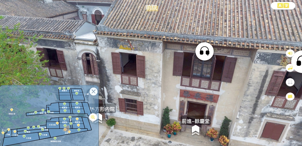 为持续推动文化遗产资源的数字化利用,文化局在2021年11月推出郑家大屋线上虚拟实景(VR)导览功能(下图),参观者只须滑动鼠标,便可360度「云参观」郑家大屋。适逢今年为郑观应诞辰180周年纪念,文化局于今年1月推出郑家大屋现场扩增实境(AR)手机应用程式,重现郑观应编撰《盛世危言》以及昔日郑家「七十二家房客时期」的面貌外,同时设有昔日郑家大屋不同时期的动画影片、导航景区地图、寻宝游戏及多个特效拍照场景等功能,丰富市民及游客的观赏体验、加强澳门文化遗产的推广和教育内涵。