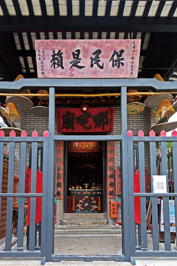 正殿入口前是哪咤庙之门厅,是座一歇山式建筑,其部份屋顶重迭于正殿屋顶上。门厅三面不砌墙,仅以黑色木栏栅围绕,形成一个虚空间,并与庙宇的实体部份形成虚实对比的关系。整个屋顶由正面两根石柱及插入正殿山墙之木梁承托,石柱刻有长联:「何者是前身漫向太虚寻故我;吾神原直道敢生多事惑斯民。」建筑正脊有鳌鱼及宝珠衬托,垂脊呈飞檐状。建筑整体装饰简约,风格平实。
