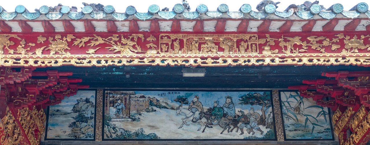 庙顶正脊有彩色灰塑的脊饰,外墙两侧的砖雕与大门上方的壁画,加上木雕和石雕,使庙宇给人华丽的感觉。