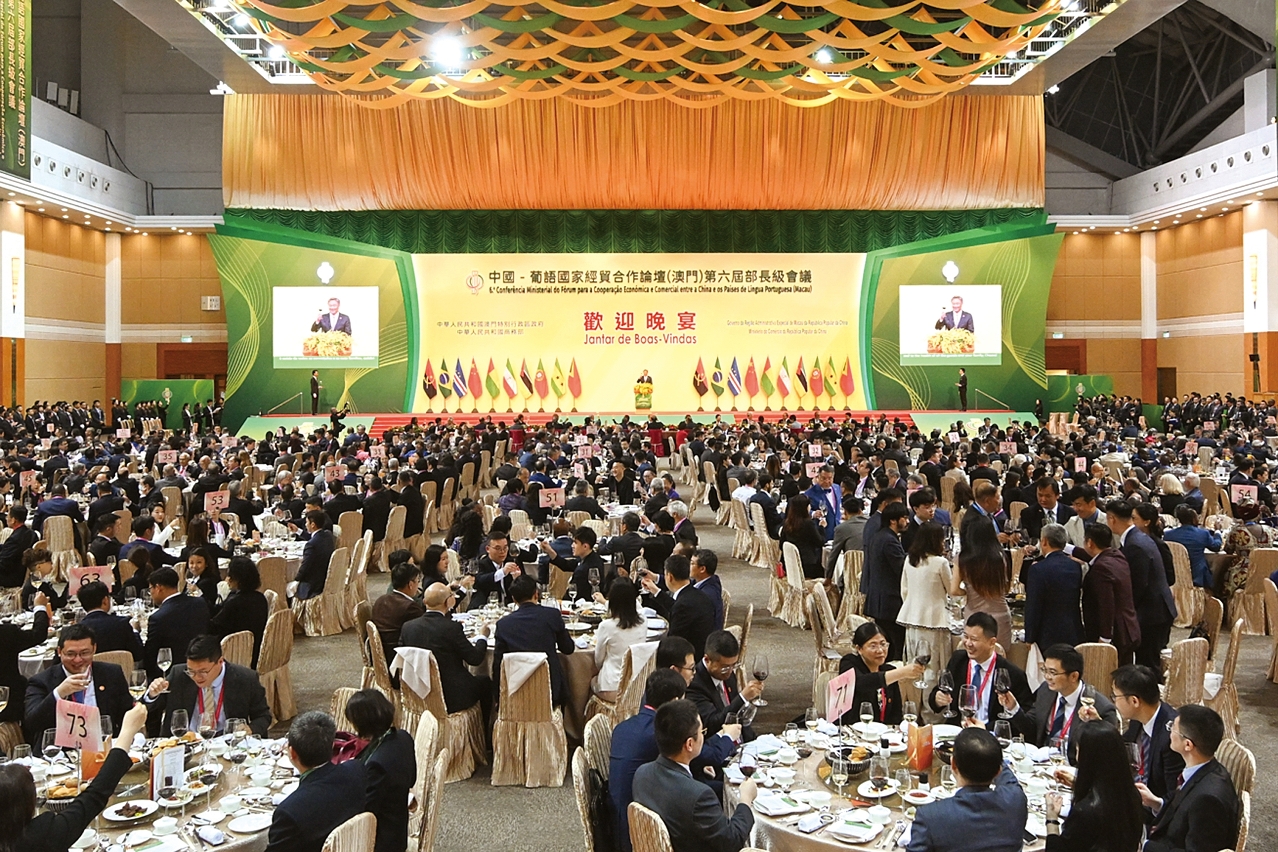 4月21日晚上,中葡论坛(澳门)第六届部长级会议欢迎晚宴在澳门东亚运动会体育馆国际会议展览中心举行,中共中央政治局委员、全国人大常委会副委员长李鸿忠,以及各葡语国家领导人及代表团团长出席。