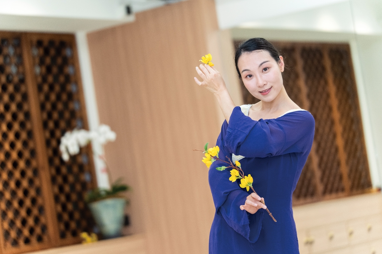 于2020年加入“承舞纪”的卢雪翩,是团中的资深师姐。排练时,她总是热心协助团员,细心提醒正确的走位与舞步。即使在没有观众的舞室,她的舞姿依然柔美生动,充满生命力。“我最初学习民族舞,后来想多瞭解古典舞,便报名加入‘承舞纪’的汉唐雅韵班,后来成为团员。”