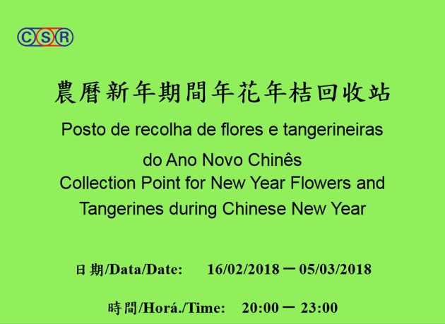 按照传统习俗,市民会购置年花、年桔布置家居,因此每年春节后有大量年花、年桔被弃置。为善用绿色资源,民署将于二月十六日至三月五日把大体积垃圾收集站改为年花年桔收集站,并更换相关指示牌,以便市民知悉。市民可于上述期间的晚上八时至十一时,把不再使用的年花年桔放置在收集站内。民署会将回收的年花和年桔破碎及作堆肥处理,其后应用于绿化带上,以便改良土质。