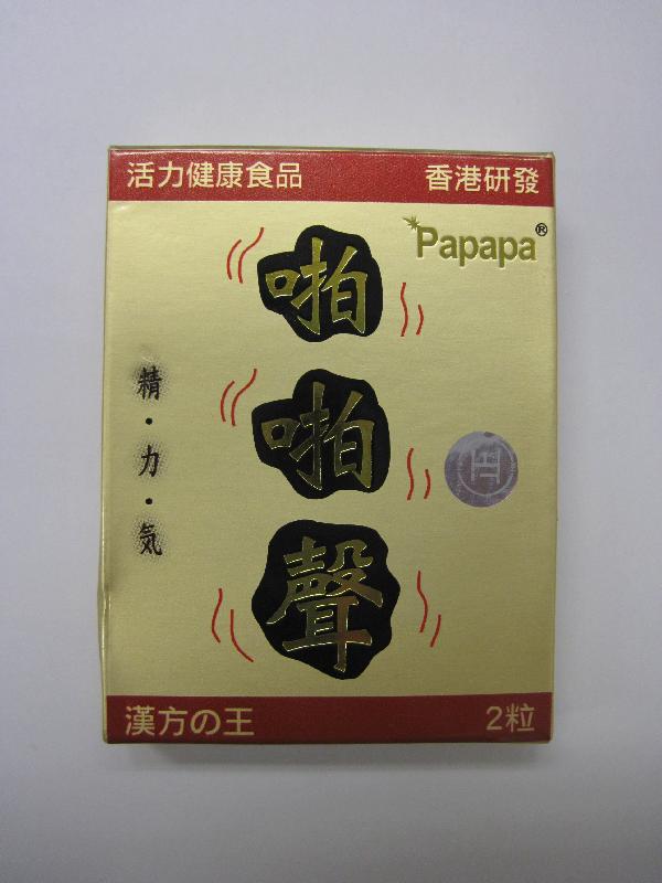根据香港卫生署公告,产品“啪啪声”(Papapa)被发现掺杂有西药成份“他达拉非”(tadalafil)、“hydroxyhomosildenafil”及“hydroxythiohomosildenafil”,基于此,该署呼吁居民不要购买及服用上述产品。而根据纪录,卫生局并没有批准过上述产品进口及投放本澳市场。