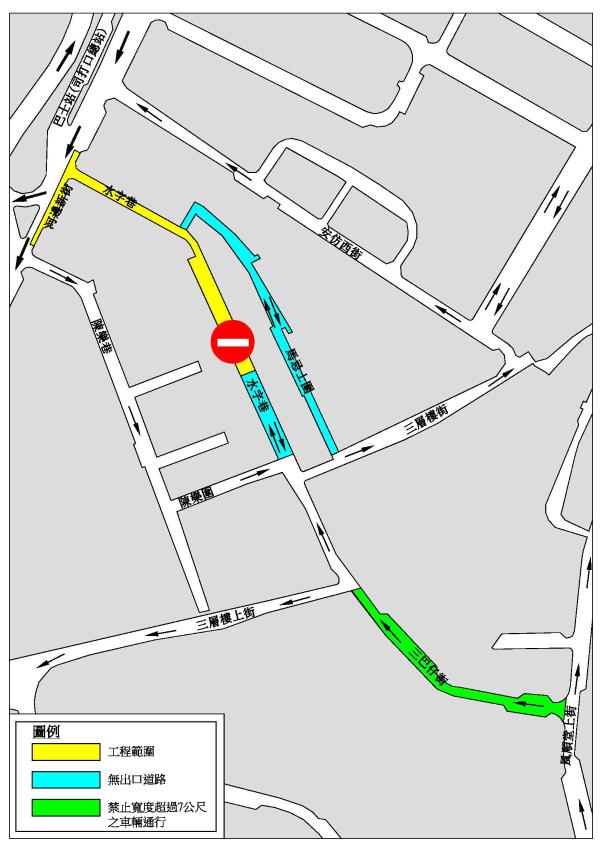 因铺设水管、电缆及维修路面,3月12日(周一)至21日(周三),河边新街近水字巷的路段实施有限度通车,水字巷及马忌士围则改为无出口道路,同时禁止车身长度超过7公尺的车辆由风顺堂上街转入三巴仔街,交通事务局呼吁公众留意。