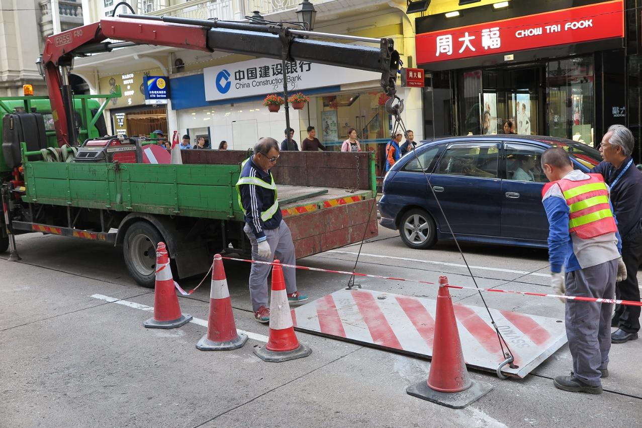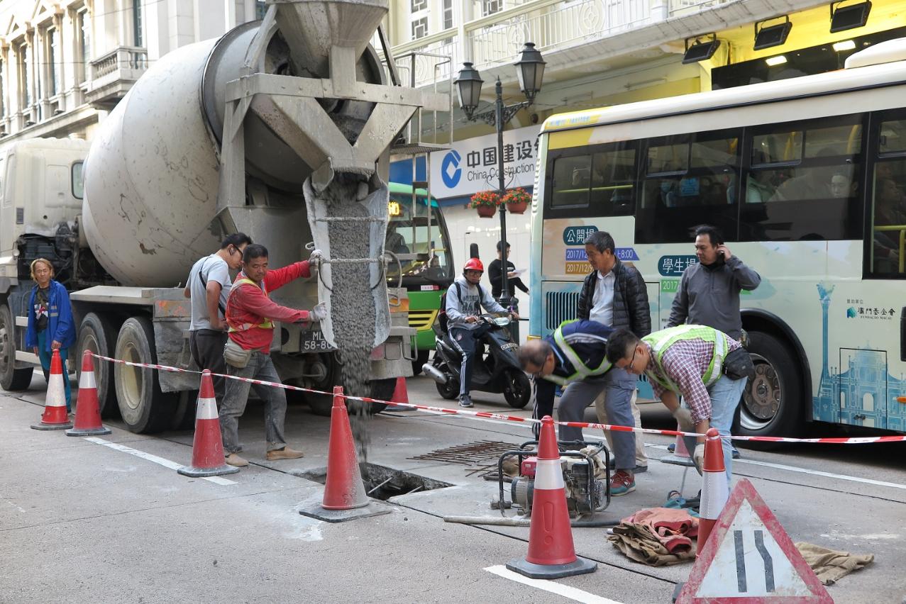 民政总署人员今早(三月二十日) 发现新马路近龙嵩正街交界有路面出现凹陷,已实时派员到现场跟进。为保障行车安全及减低公众的影响,民署经评估采取了紧急措施,将孔洞作灌浆处理并盖上钢板,有关路段已于下午约五时三十分恢复通车。